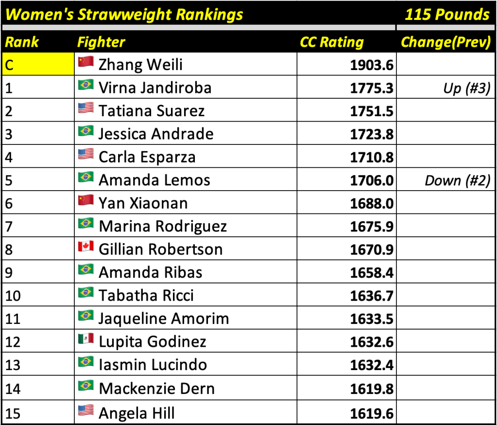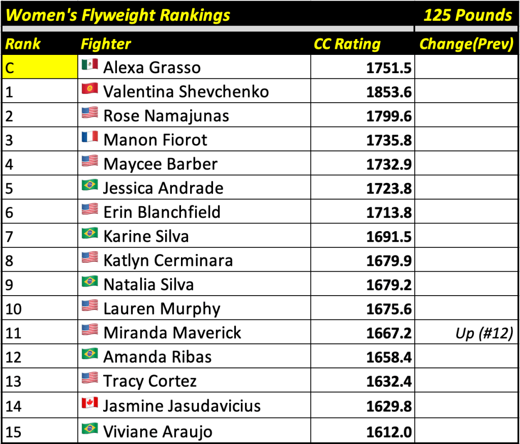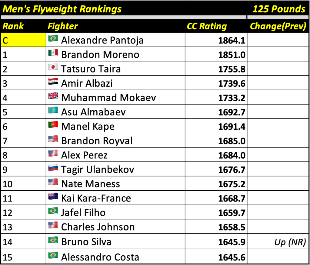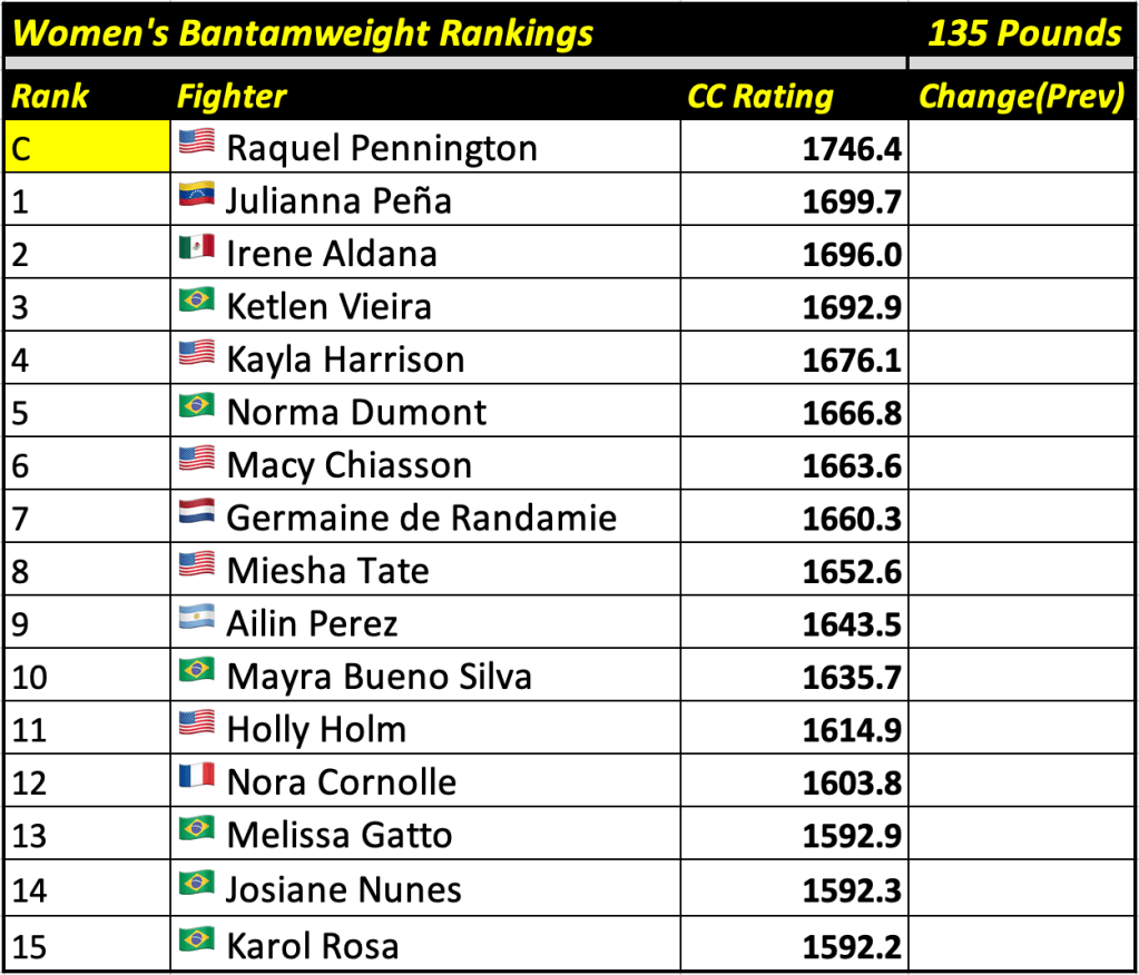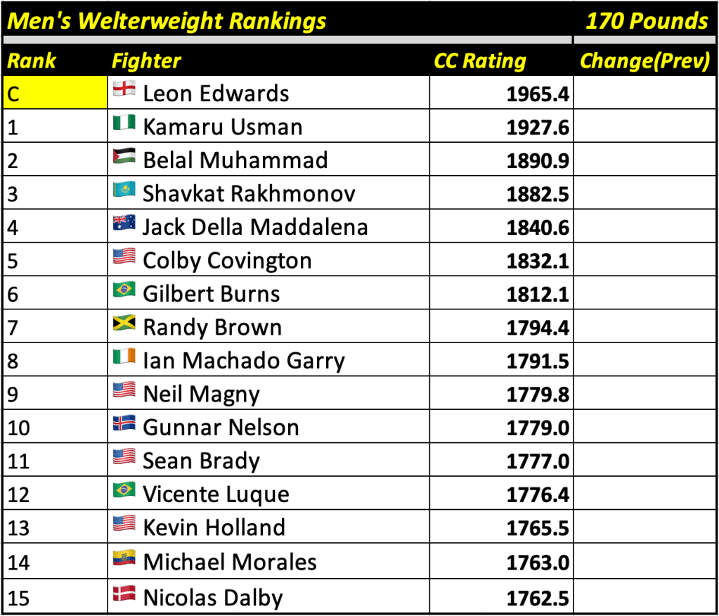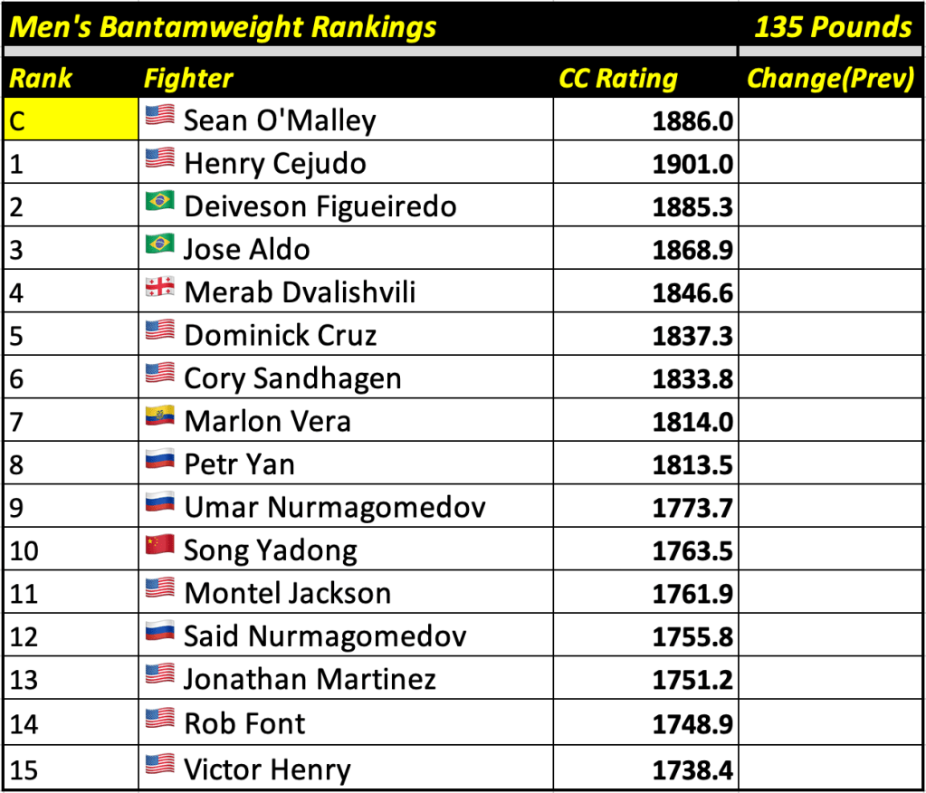 These rankings will also rank the top 15 male and female fighters overall. Note, we do not call them “pound-for-pound” rankings as most do, as the CC Rating is a metric of dominance and performance as opposed to talent relative to size. So, they will simply be called “Overall Male” and “Overall Female” rankings.