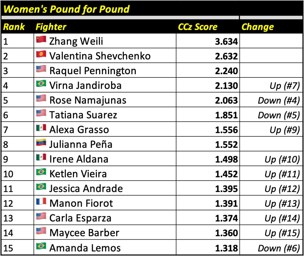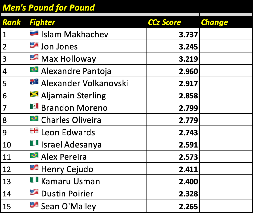 The Cage Calculus Pound for Pound Rankings is based on a fighter’s CCz Score. The CCz Score is a score that shows how much better a given fighter is than the average fighter in their respective weight class.