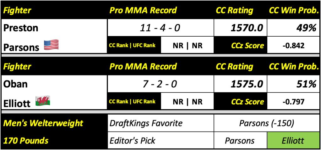 Both men are versatile in this one. Parsons might have a slight advantage in the wrestling and Elliott on the feet. With Elliott gifted enough in grappling, he should be able to keep this mostly on the feet, find a rhythm, and cruise to a decision win. Conversely, both men could swing for the fences early and it’s a coin flip. Either way, Elliott seems like a live underdog with more paths to victory.