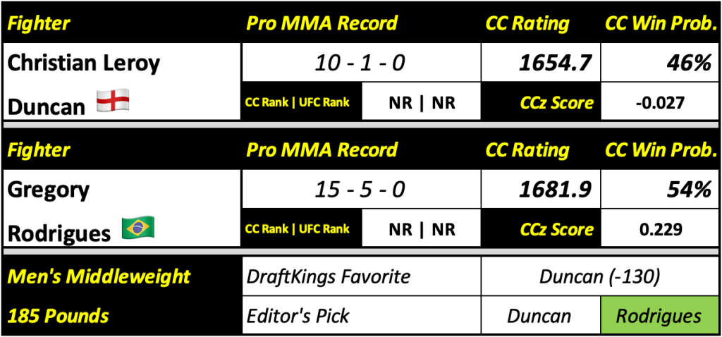 This one ought to be fun. Duncan is a fantastic kicker and excels at range. Rodrigues will have the advantage in the wrestling and can also turn any fight into a dogfight. Rodrigues is going to be a much harder out than Duncan’s more recent opponents. Rodrigues can hold his own on the feet and use that to get close and create the dirty fight that gives him a clear advantage.