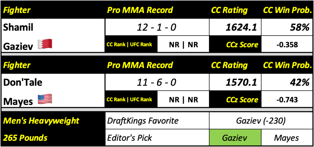 Gaziev is the more talented fighter here. He was thrust into a main event in just his second UFC appearance. He ultimately couldn’t handle a five round fight and faltered as the fight went on. This should be an easier test, but Mayes does have half of his UFC wins coming by decision. Mayes needs to weather the early storm and get to the scorecards, stealing rounds two and three. It’s a very narrow path to victory. Gaziev should have learned by now and won’t come in as unprepared as last time.