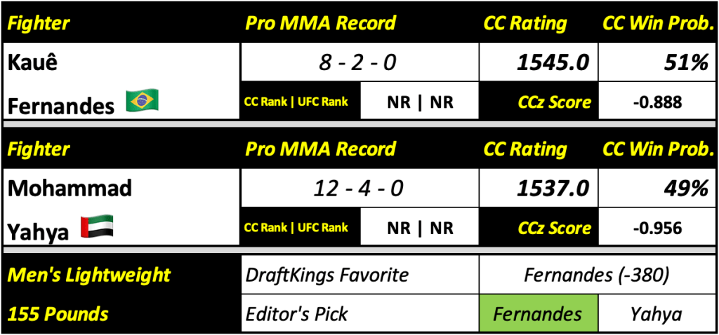 Both fighters are strikers. Yahya has more raw KO power, whereas Fernandes is more technical. The Brazilian has to keep the fight on the outside and avoid Yahya’s power for as long as possible. He has the tools to do so.