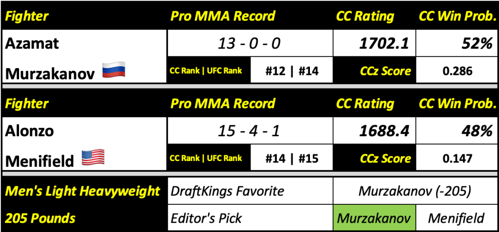 Murzakanov continues his unbeaten run into this chance to improve his stock in the light heavyweight division. He is a short light heavyweight, but has good reach and speed. Menfield might rush to try and close distance or even get the fight to the ground (though, he may not want to rush as hard as he did against Carlos Ulberg). Ultimately, Murzakanov’s speed and striking will cause the same problems for Menifield as they have all of his other opponents thus far.