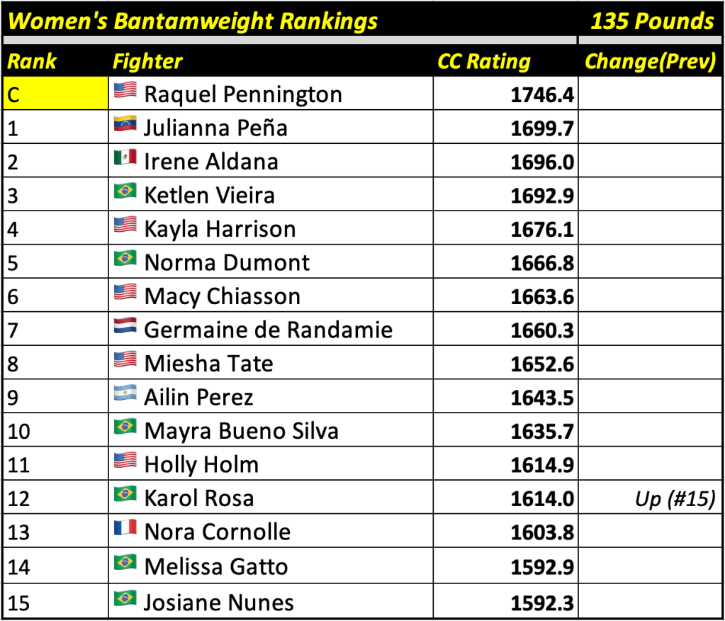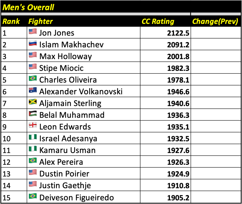 These rankings will also rank the top 15 male and female fighters overall. Note, we do not call them “pound-for-pound” rankings as most do, as the CC Rating is a metric of dominance and performance as opposed to talent relative to size. So, they will simply be called “Overall Male” and “Overall Female” rankings.
