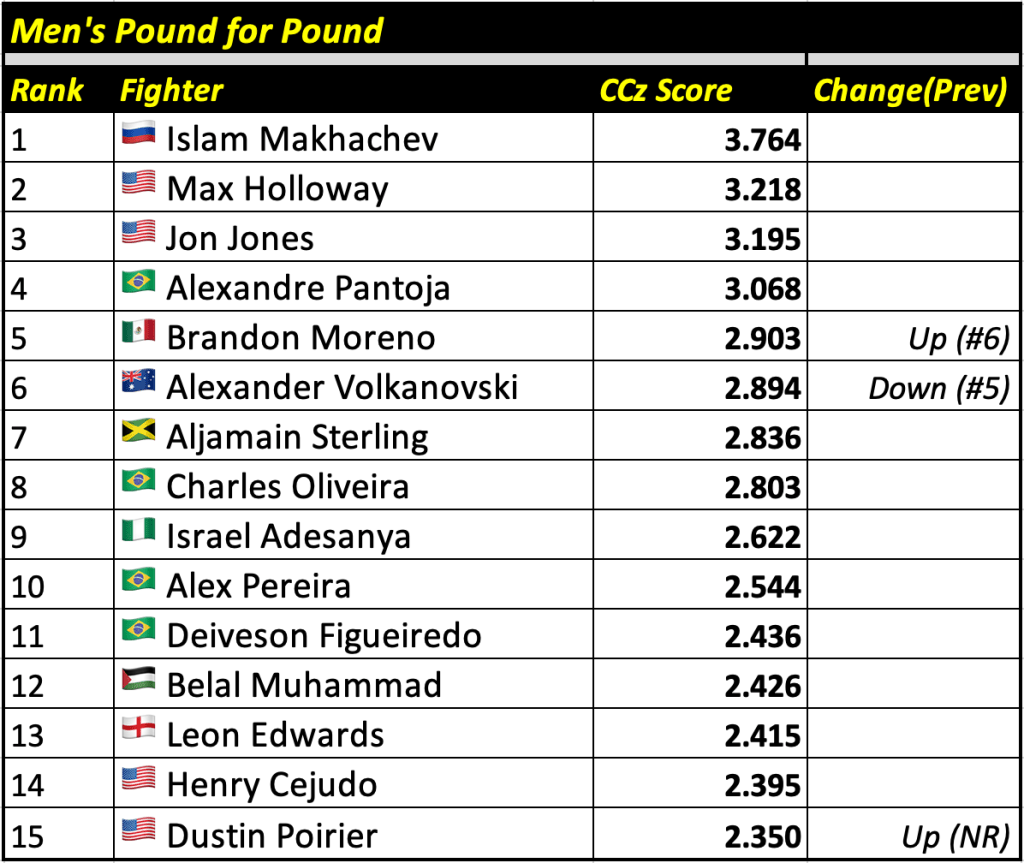 The Cage Calculus Pound for Pound Rankings is based on a fighter’s CCz Score. The CCz Score is a score that shows how much better a given fighter is than the average fighter in their respective weight class.