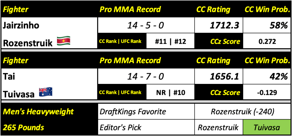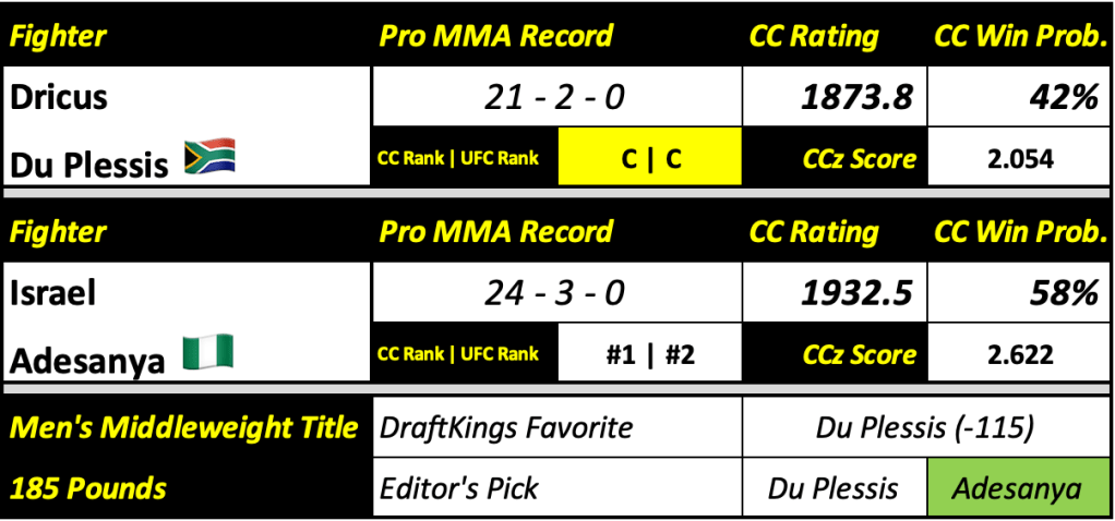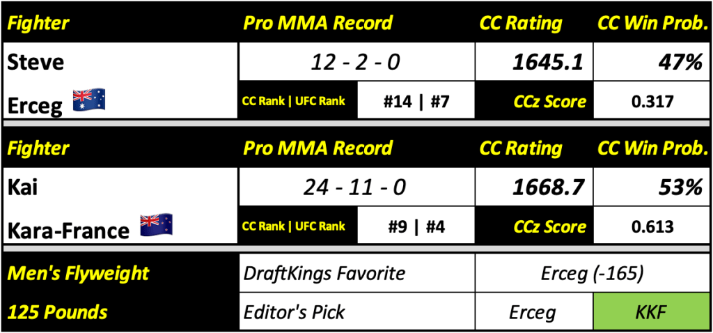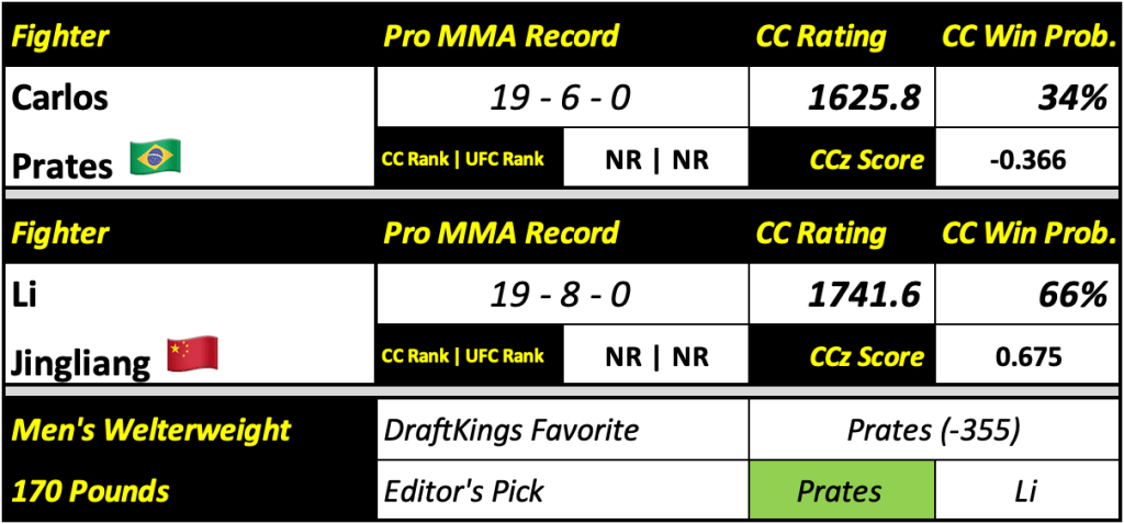 All win probabilities are based off of a fighter’s Cage Calculus (CC) Rating and their place in the CC Rankings. The fighter’s name highlighted in green at the bottom of the panel indicates the editor’s pick to win. Also featured below their record and rating is their divisional rankings in the CC Rankings and the official UFC Rankings. Any fighter falling outside of the top 15 of their respective division is classified as NR (not ranked).
