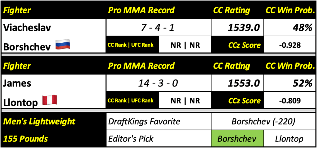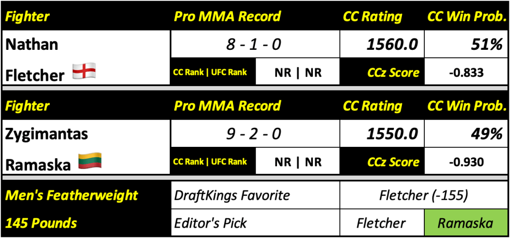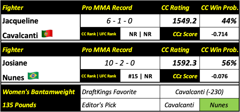 All win probabilities are based off of a fighter’s Cage Calculus (CC) Rating and their place in the CC Rankings. The fighter’s name highlighted in green at the bottom of the panel indicates the editor’s pick to win. Also featured below their record and rating is their divisional rankings in the CC Rankings and the official UFC Rankings. Any fighter falling outside of the top 15 of their respective division is classified as NR (not ranked).