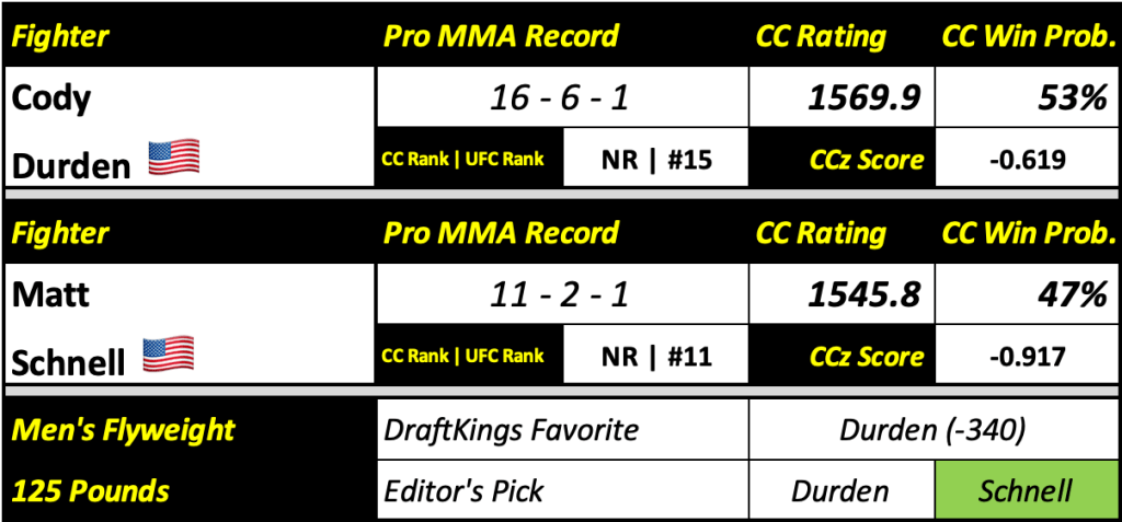 All win probabilities are based off of a fighter’s Cage Calculus (CC) Rating and their place in the CC Rankings. The fighter’s name highlighted in green at the bottom of the panel indicates the editor’s pick to win. Also featured below their record and rating is their divisional rankings in the CC Rankings and the official UFC Rankings. Any fighter falling outside of the top 15 of their respective division is classified as NR (not ranked).
