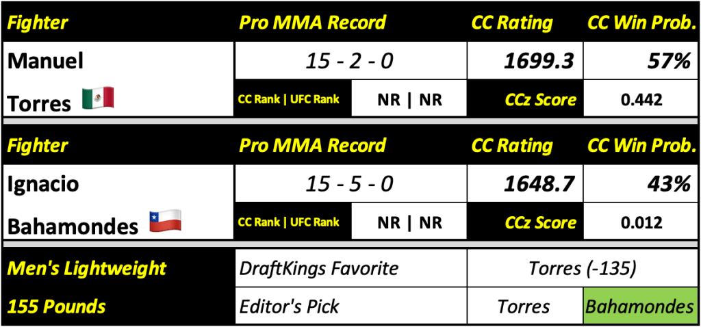 Don’t blink. This is an easy favorite for fight of the night. Both men finish fights early. Torres typically varies his finishes, with seven KOs and submissions apiece. Bahamondes, on the other hand, is a pure striker, utilizing his 6’3″ frame to keep opponents at distance and devastate them with his unique kicks. The theory of the case here is that Bahamondes uses his kicks to keep Torres out of range for a takedown. Torres will either try anyway and get caught, or get picked apart en route to a decision win for Bahamondes.