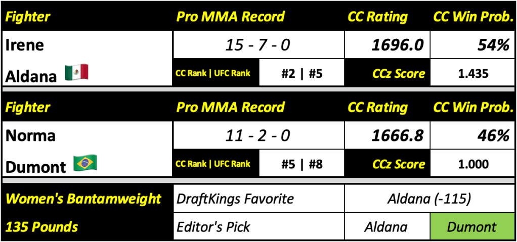 If you’ve read Cage Calculus long enough, you know that this editor develops an attachment to certain fighters. Dumont is one such fighter. If she lets her hands go and allows herself to be aggressive, she has the potential to be the champion of this division. She’s that good. The hangup is that she often fights cautiously or accepts the clinch too often. her playbook against Aldana should be the same she used to beat Germaine de Randamie. Flurried punches to open the way to a takedown. Dumont is big for this division and can dictate pace on the ground. One area of improvement is being more active and causing damage on the ground once there. Aldana will have a height and range advantage, though. This is why Dumont cannot accept distance striking. If Dumont can pull it off, this would be a statement win and should pave the way for a title shot in the future.