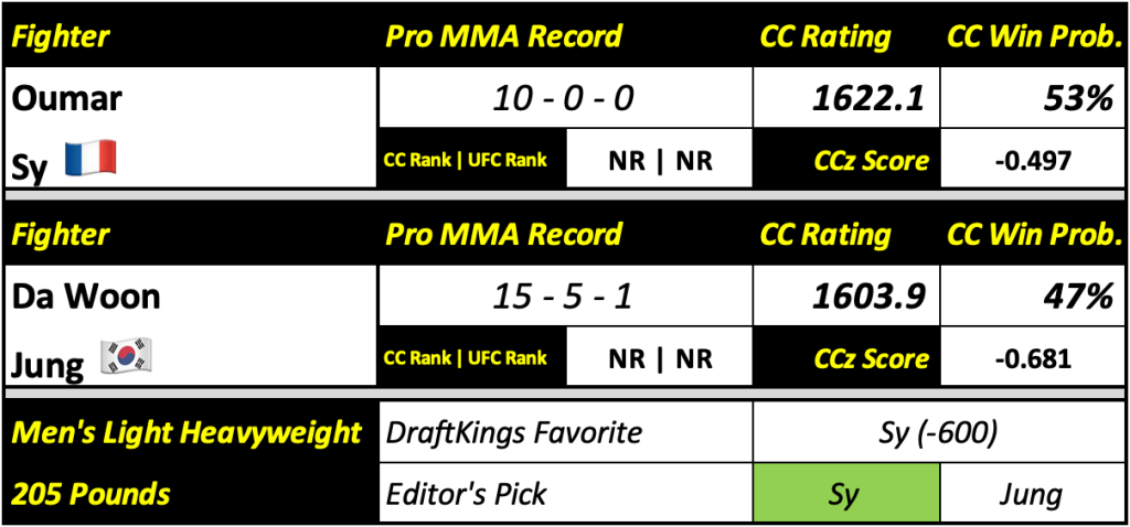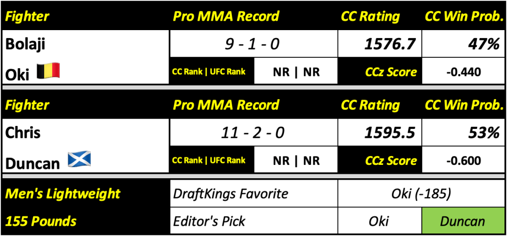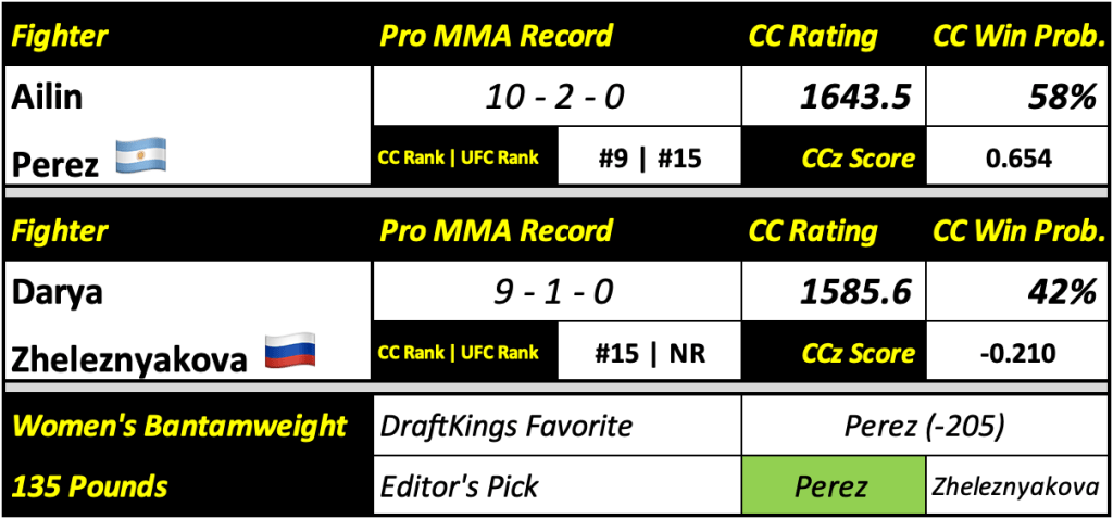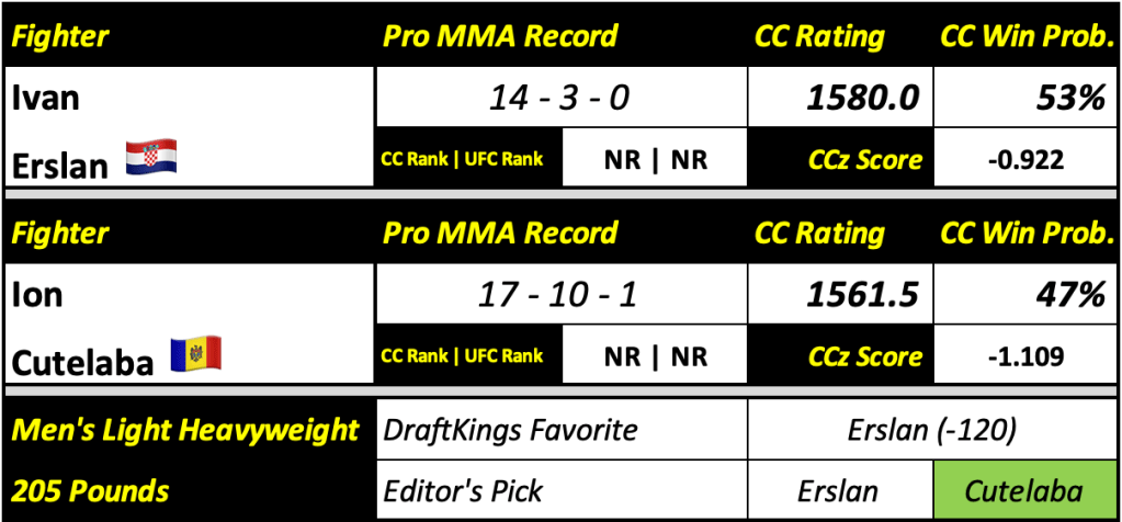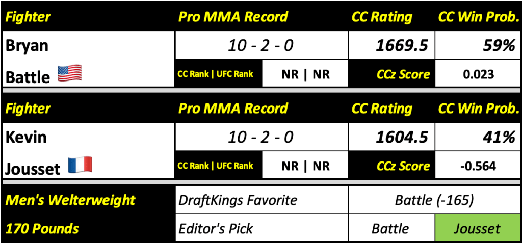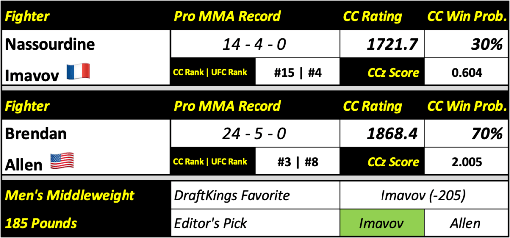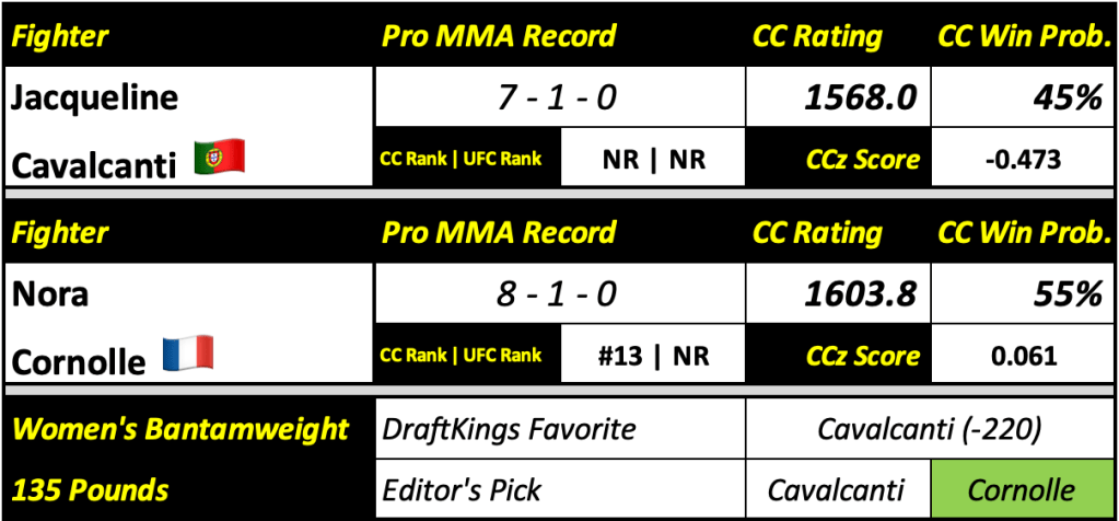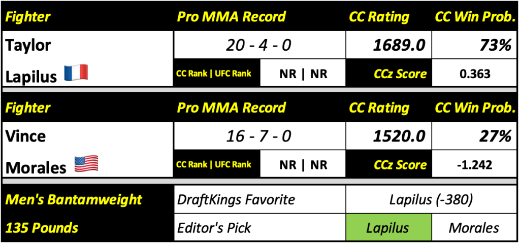 All win probabilities are based off of a fighter’s Cage Calculus (CC) Rating and their place in the CC Rankings. The fighter’s name highlighted in green at the bottom of the panel indicates the editor’s pick to win. Also featured below their record and rating is their divisional rankings in the CC Rankings and the official UFC Rankings. Any fighter falling outside of the top 15 of their respective division is classified as NR (not ranked).