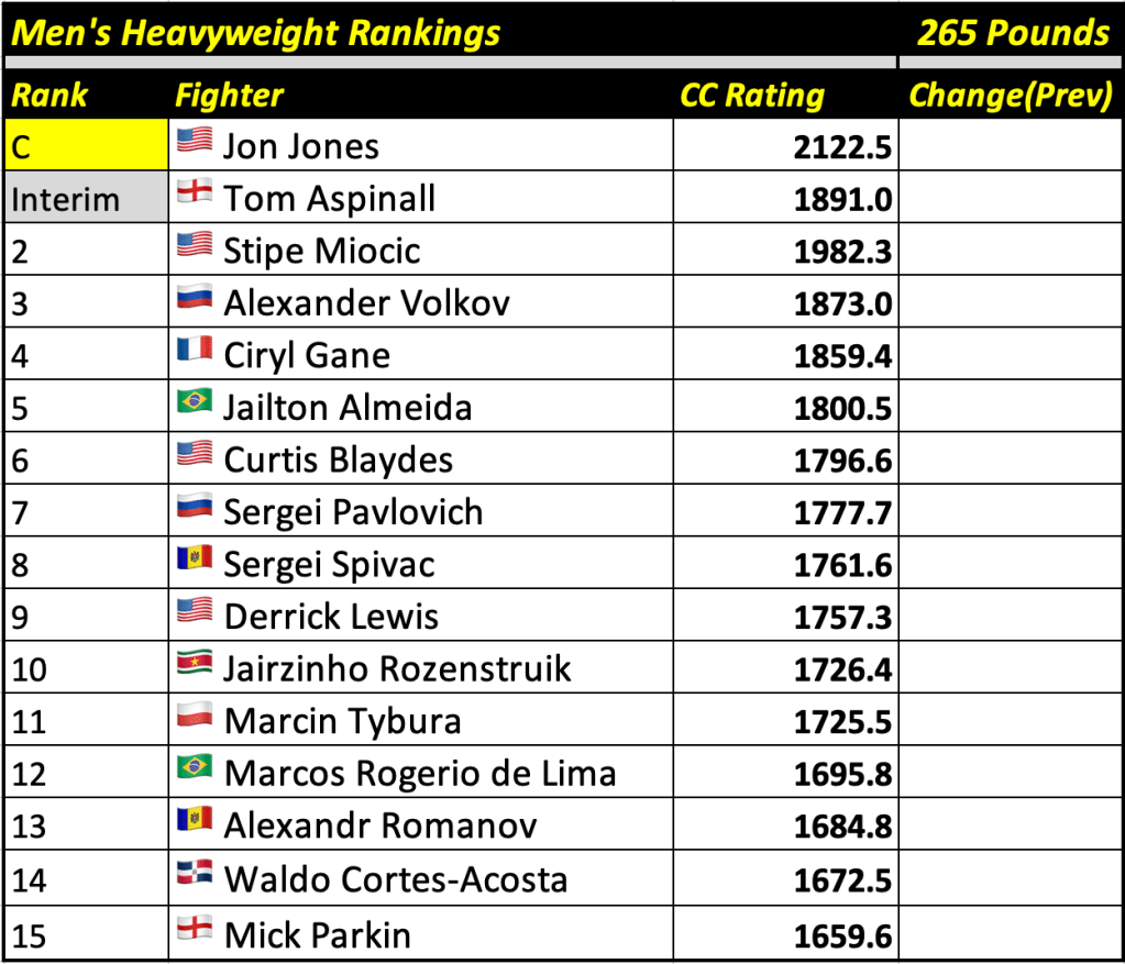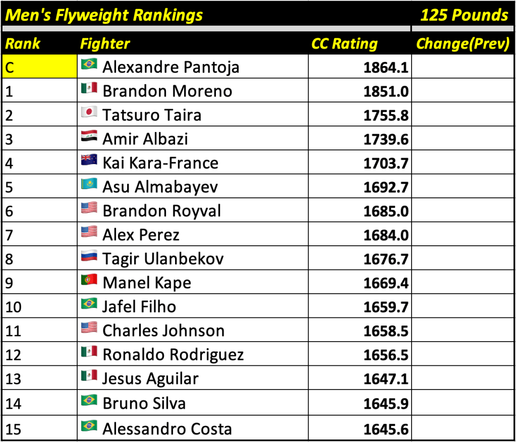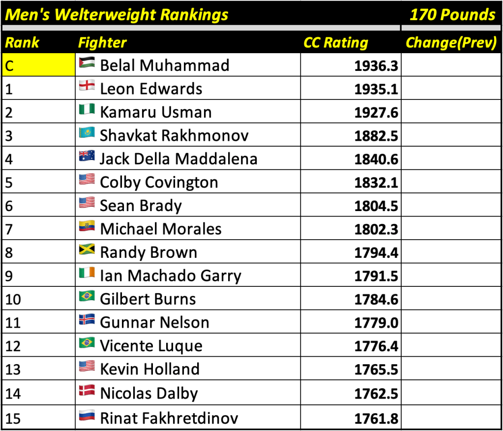 After every UFC fight card, Cage Calculus will publish up-to-date rankings based on our forecast algorithm. The rankings will display the champion and the top 15 contenders in each weight division, alongside their CC Rating (the champion will always be displayed at the top regardless of whether or not they are the highest rated fighter in their division).