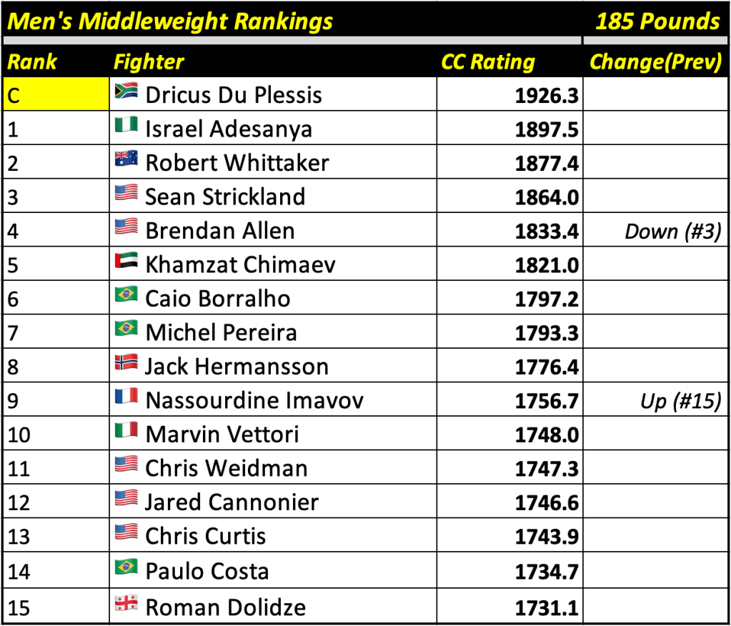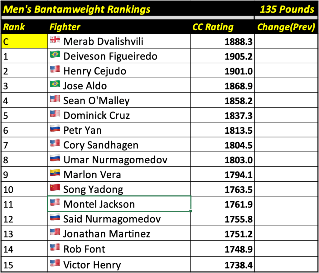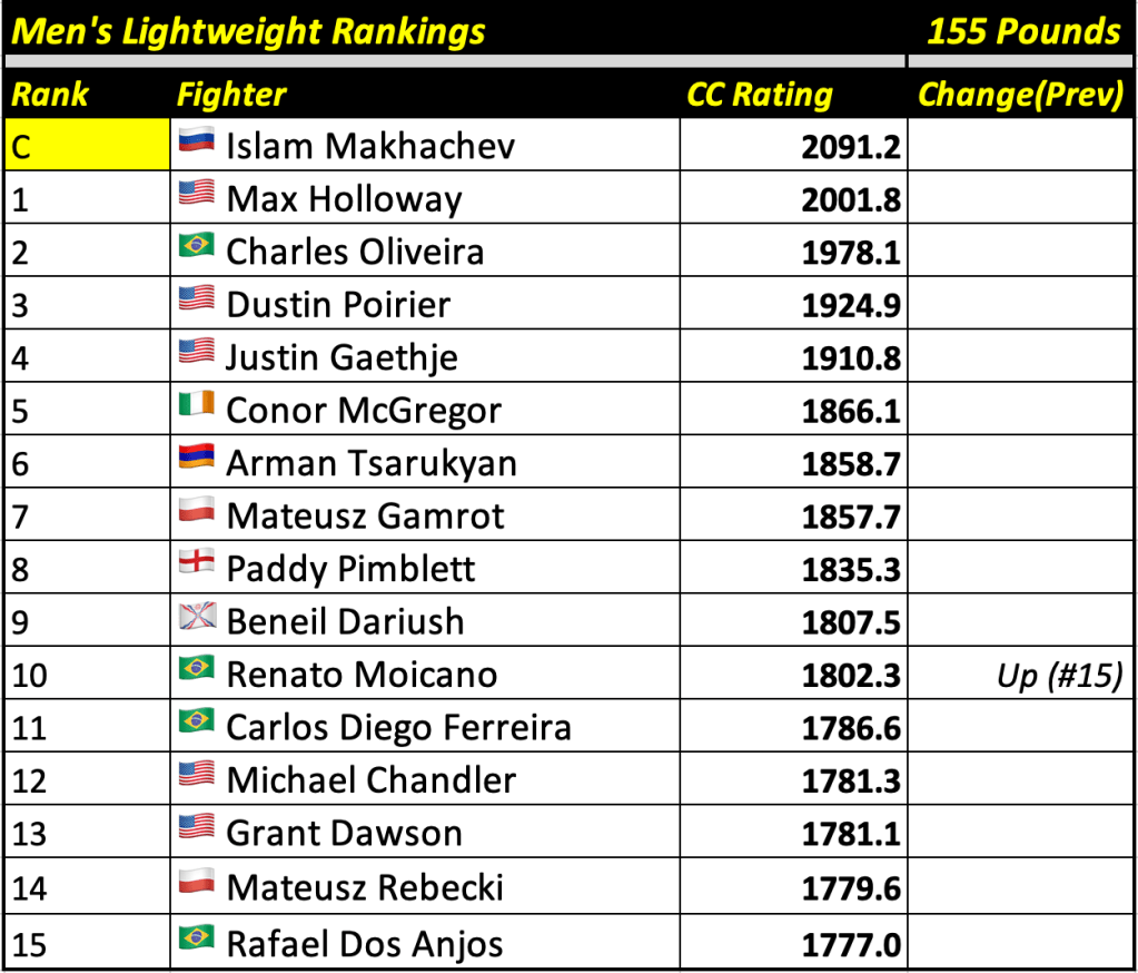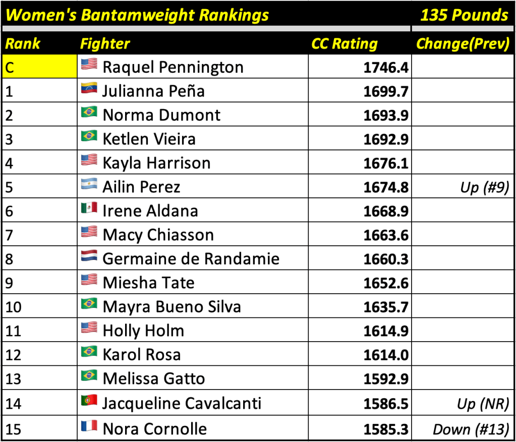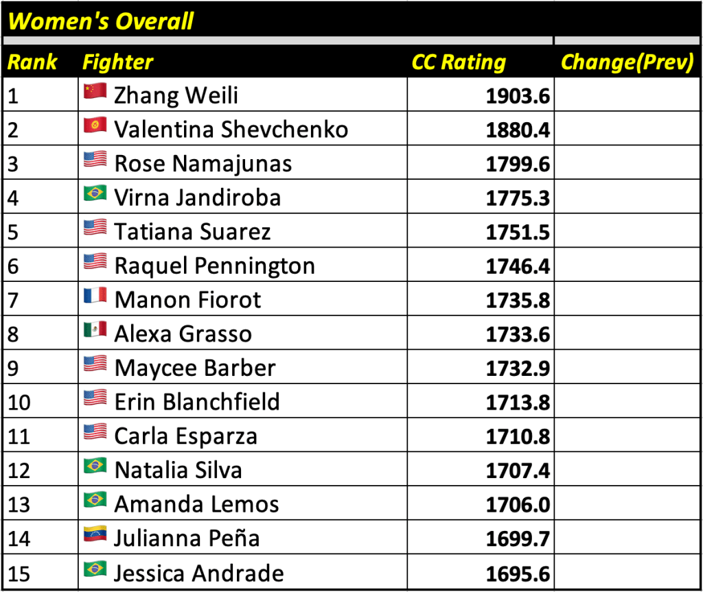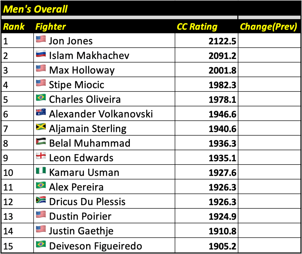 These rankings will also rank the top 15 male and female fighters overall. Note, we do not call them “pound-for-pound” rankings as most do, as the CC Rating is a metric of dominance and performance as opposed to talent relative to size. So, they will simply be called “Overall Male” and “Overall Female” rankings.