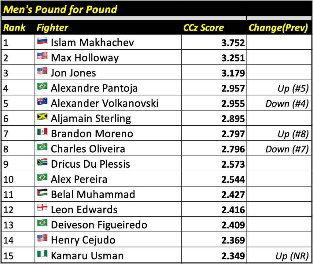 The Cage Calculus Pound for Pound Rankings is based on a fighter’s CCz Score. The CCz Score is a score that shows how much better a given fighter is than the average fighter in their respective weight class.