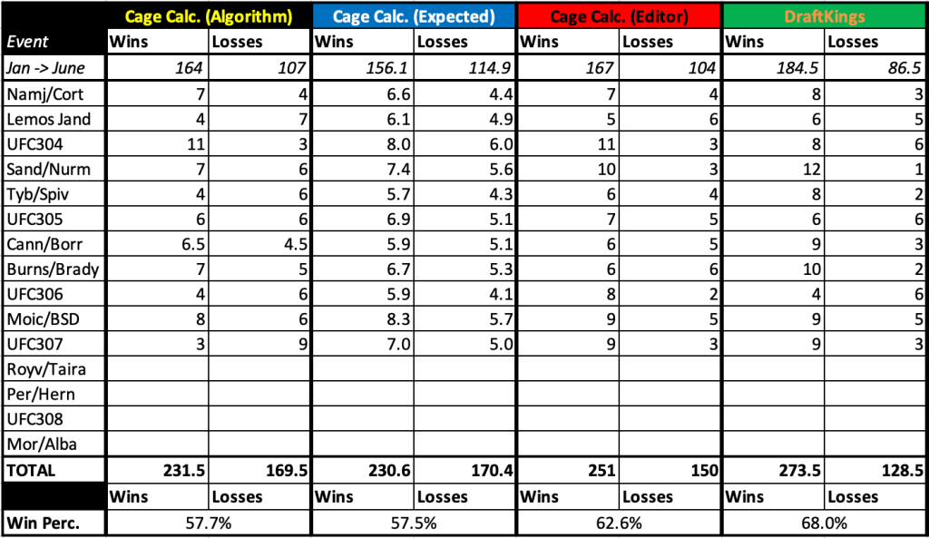 After every event, check back in to see how our algorithm and our editor’s picks stack up against the DraftKings Sportsbook. You can also see how many wins the algorithm expects, given the probabilities it generates (for example, if the algorithm gives ten fighters a 60 percent chance of winning, it would only expect six of them to win with those odds). How close the algorithm is to its expected numbers gives a better picture of its accuracy. You can read more about this in our methodology page.