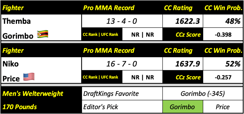 All win probabilities are based off of a fighter’s Cage Calculus (CC) Rating and their place in the CC Rankings. The fighter’s name highlighted in green at the bottom of the panel indicates the editor’s pick to win. Also featured below their record and rating is their divisional rankings in the CC Rankings and the official UFC Rankings. Any fighter falling outside of the top 15 of their respective division is classified as NR (not ranked).