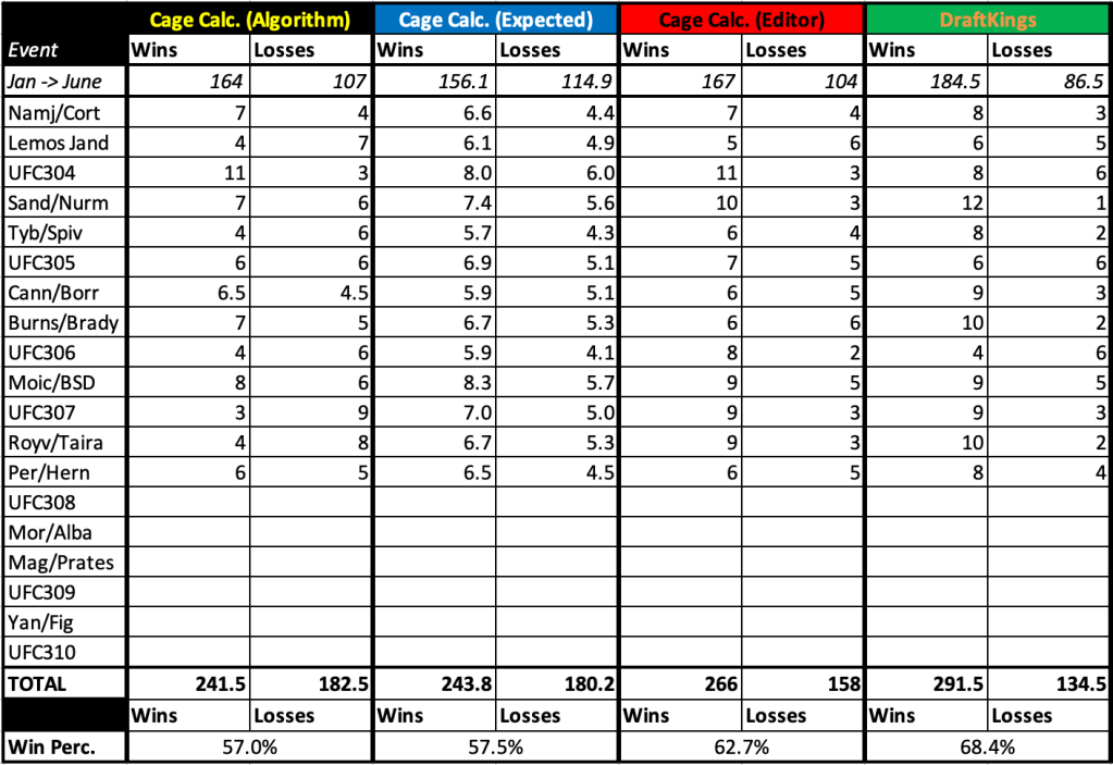 After every event, check back in to see how our algorithm and our editor’s picks stack up against the DraftKings Sportsbook. You can also see how many wins the algorithm expects, given the probabilities it generates (for example, if the algorithm gives ten fighters a 60 percent chance of winning, it would only expect six of them to win with those odds). How close the algorithm is to its expected numbers gives a better picture of its accuracy. You can read more about this in our methodology page.