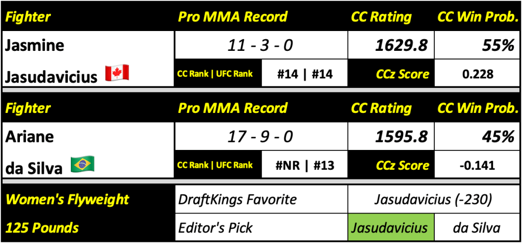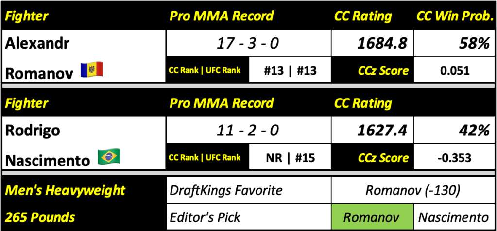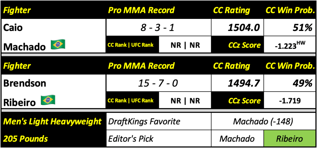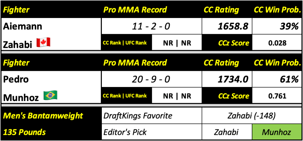 All win probabilities are based off of a fighter’s Cage Calculus (CC) Rating and their place in the CC Rankings. The fighter’s name highlighted in green at the bottom of the panel indicates the editor’s pick to win. Also featured below their record and rating is their divisional rankings in the CC Rankings and the official UFC Rankings. Any fighter falling outside of the top 15 of their respective division is classified as NR (not ranked).