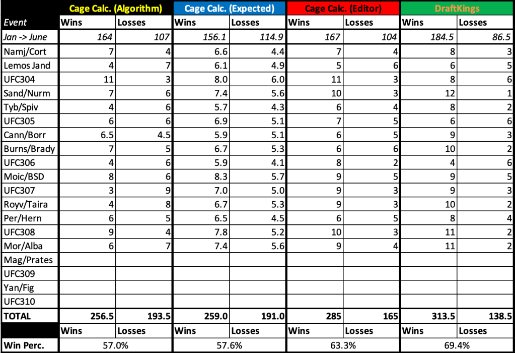 After every event, check back in to see how our algorithm and our editor’s picks stack up against the DraftKings Sportsbook. You can also see how many wins the algorithm expects, given the probabilities it generates (for example, if the algorithm gives ten fighters a 60 percent chance of winning, it would only expect six of them to win with those odds). How close the algorithm is to its expected numbers gives a better picture of its accuracy. You can read more about this in our methodology page.