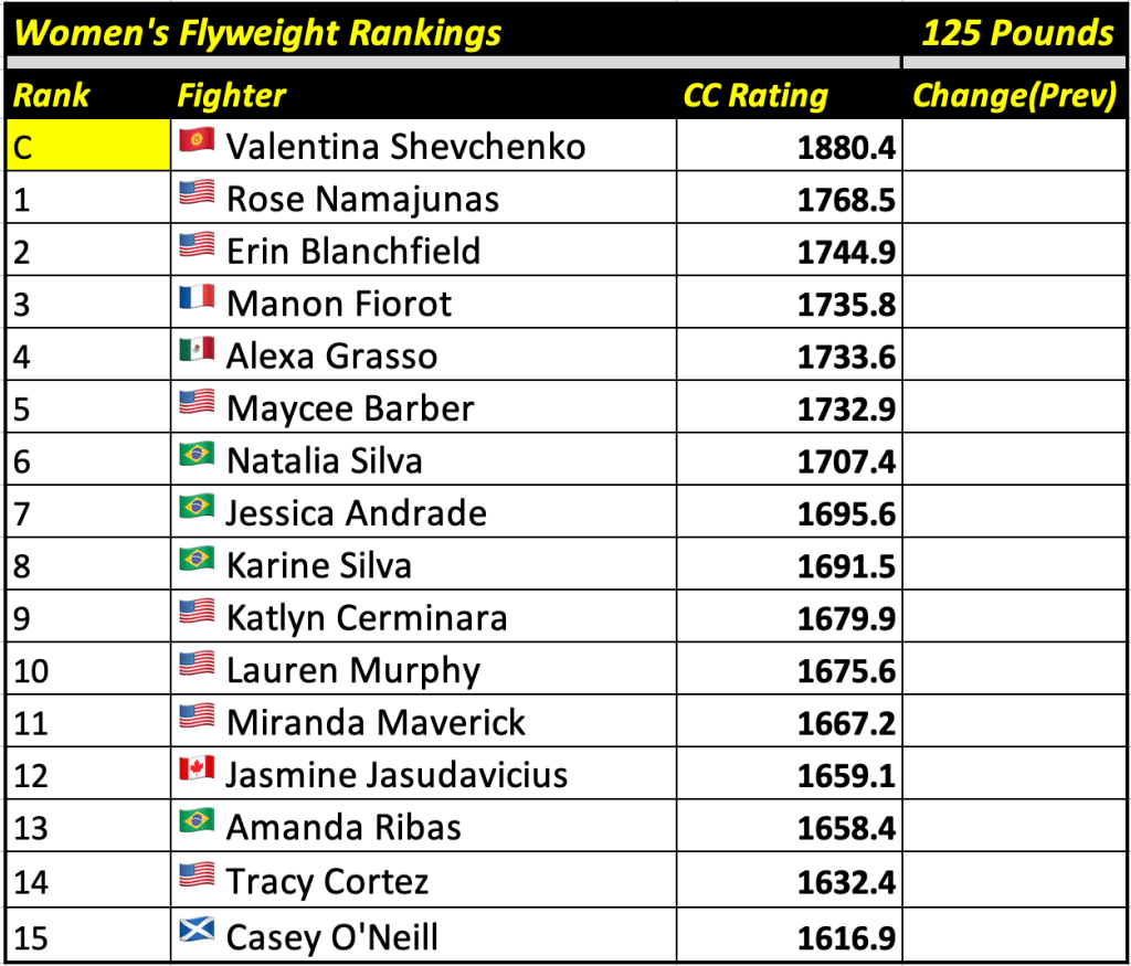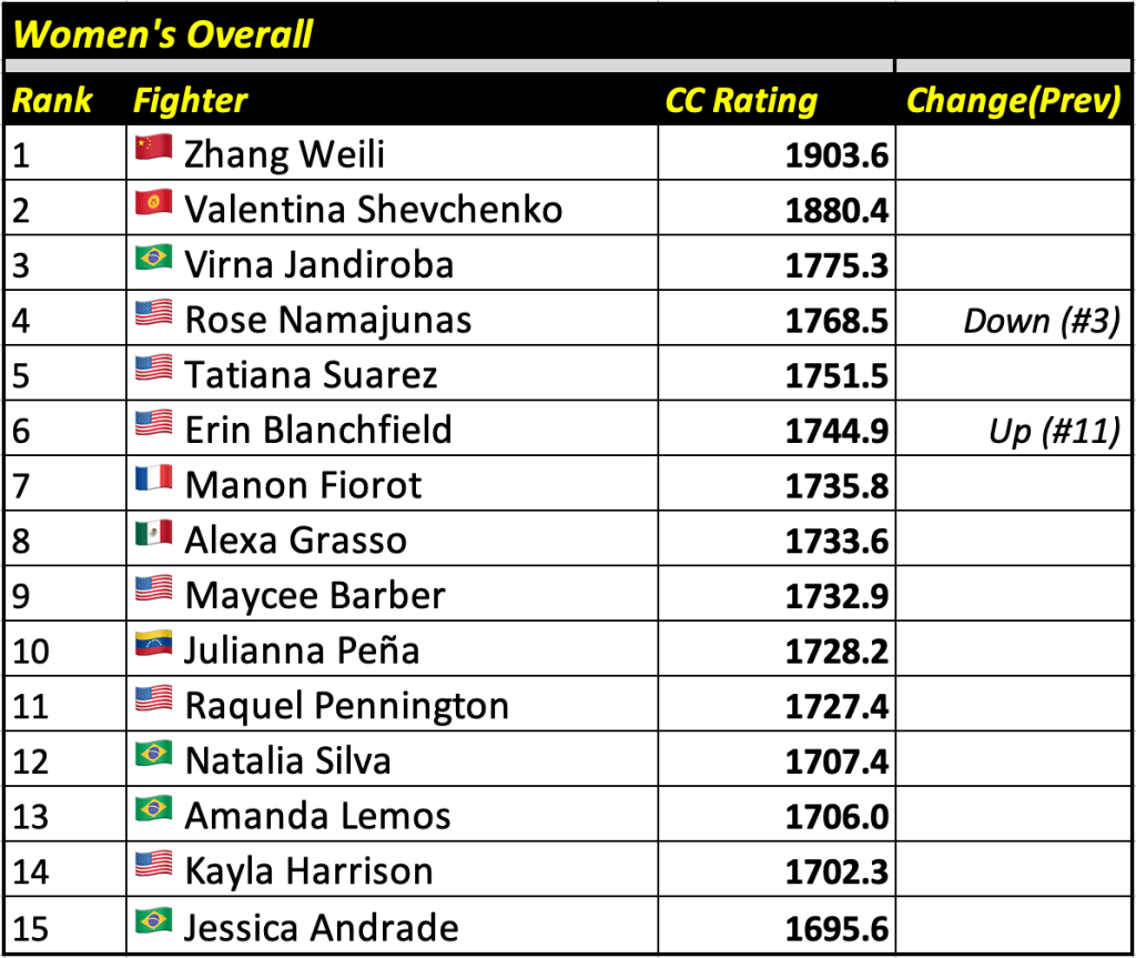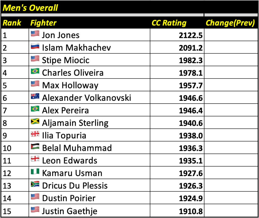 These rankings will also rank the top 15 male and female fighters overall. Note, we do not call them “pound-for-pound” rankings as most do, as the CC Rating is a metric of dominance and performance as opposed to talent relative to size. So, they will simply be called “Overall Male” and “Overall Female” rankings.