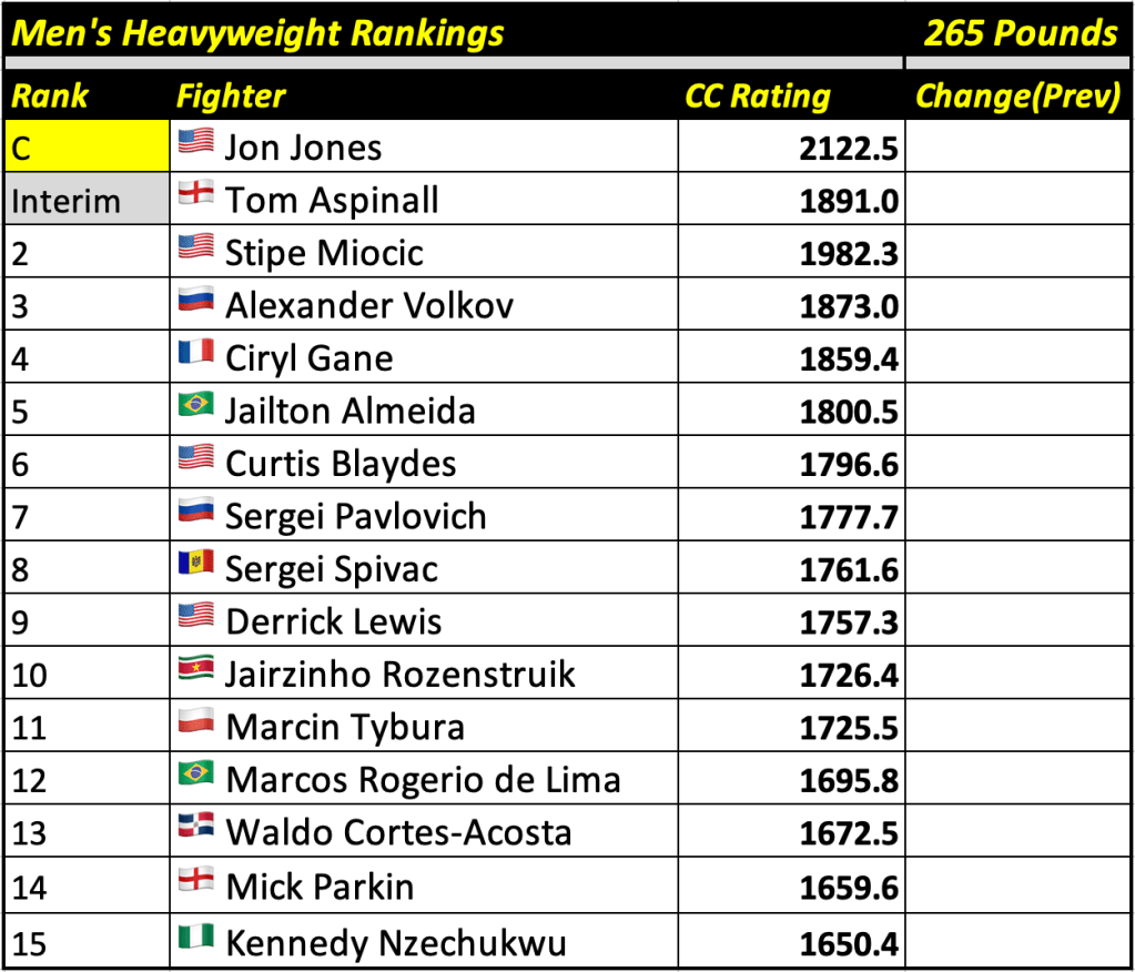 After every UFC fight card, Cage Calculus will publish up-to-date rankings based on our forecast algorithm. The rankings will display the champion and the top 15 contenders in each weight division, alongside their CC Rating (the champion will always be displayed at the top regardless of whether or not they are the highest rated fighter in their division).