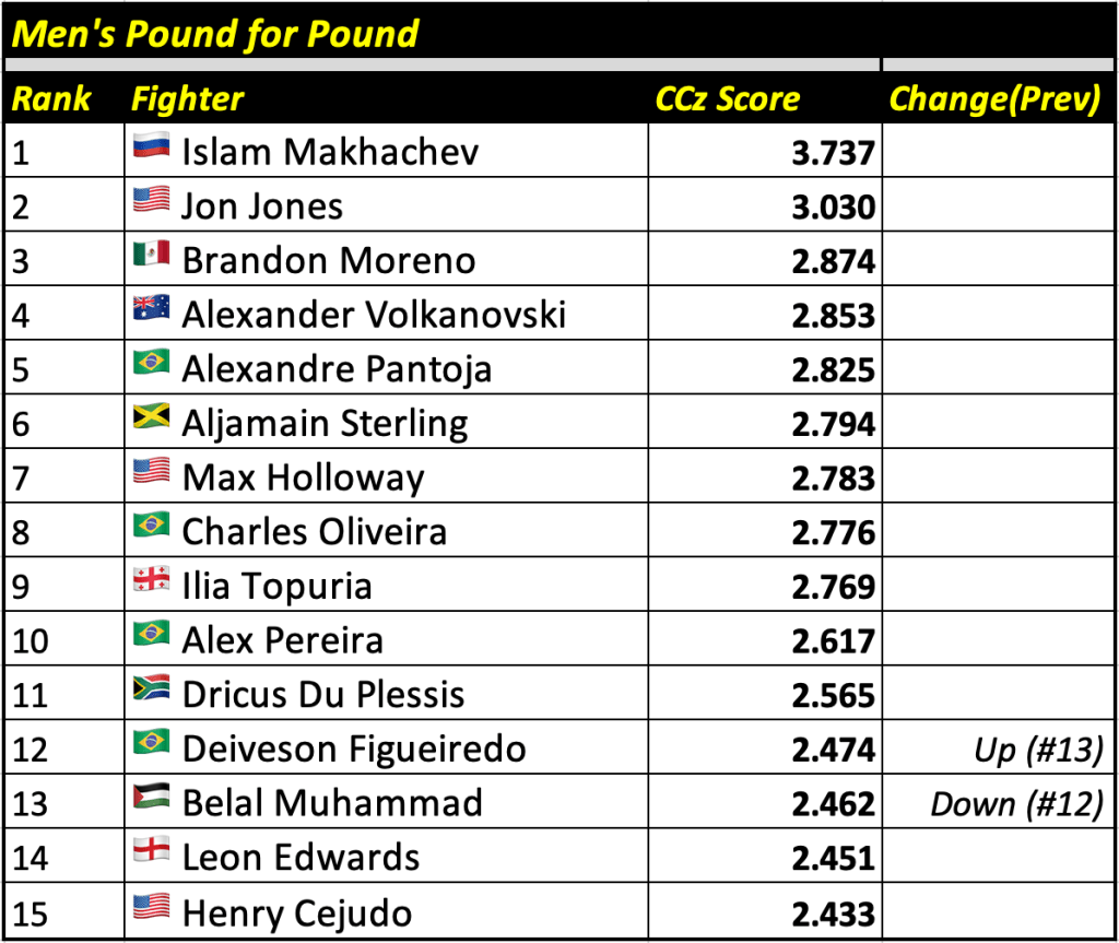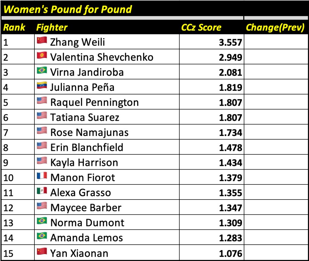 The Cage Calculus Pound for Pound Rankings is based on a fighter’s CCz Score. The CCz Score is a score that shows how much better a given fighter is than the average fighter in their respective weight class.
