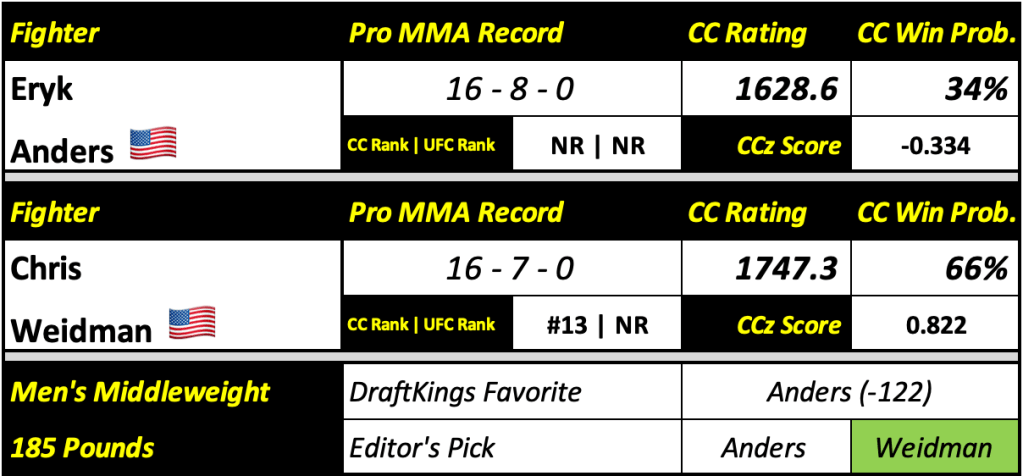 All win probabilities are based off of a fighter’s Cage Calculus (CC) Rating and their place in the CC Rankings. The fighter’s name highlighted in green at the bottom of the panel indicates the editor’s pick to win. Also featured below their record and rating is their divisional rankings in the CC Rankings and the official UFC Rankings. Any fighter falling outside of the top 15 of their respective division is classified as NR (not ranked).