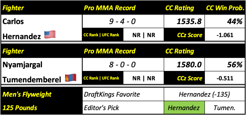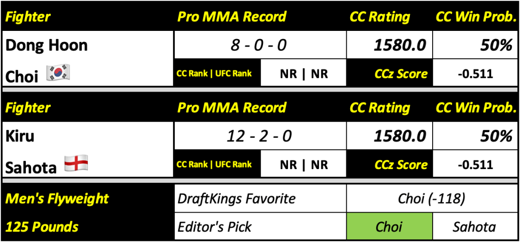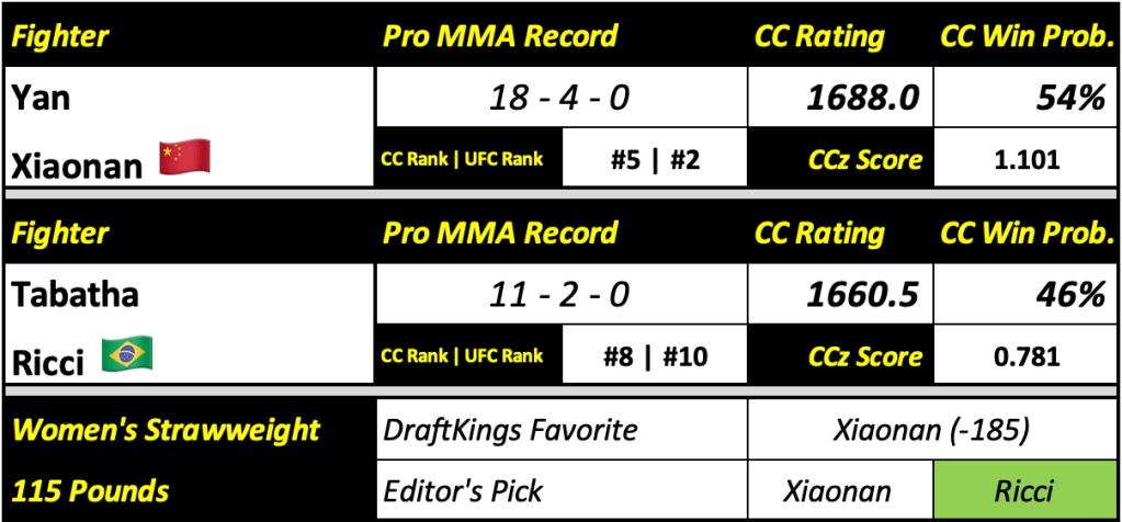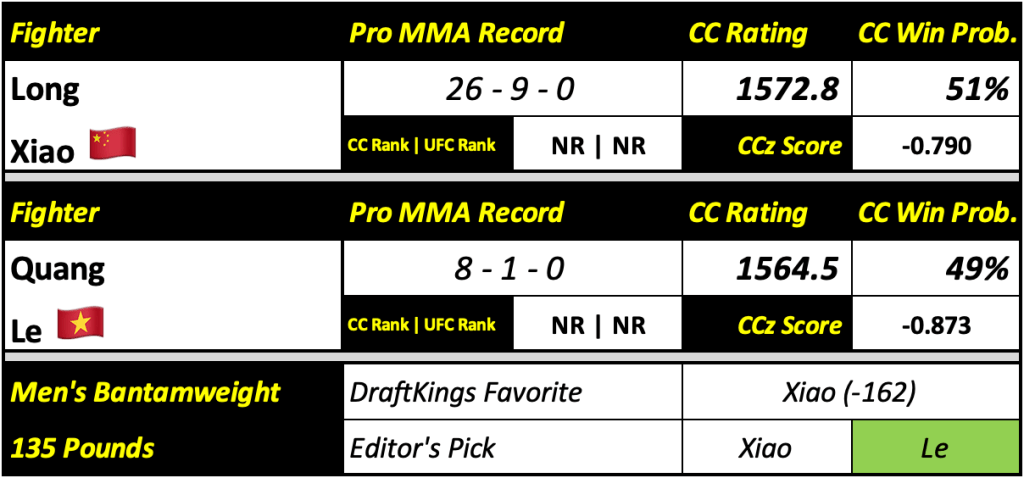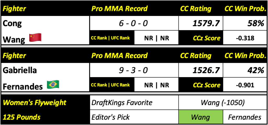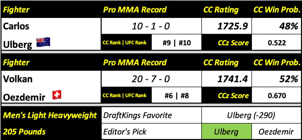 All win probabilities are based off of a fighter’s Cage Calculus (CC) Rating and their place in the CC Rankings. The fighter’s name highlighted in green at the bottom of the panel indicates the editor’s pick to win. Also featured below their record and rating is their divisional rankings in the CC Rankings and the official UFC Rankings. Any fighter falling outside of the top 15 of their respective division is classified as NR (not ranked).