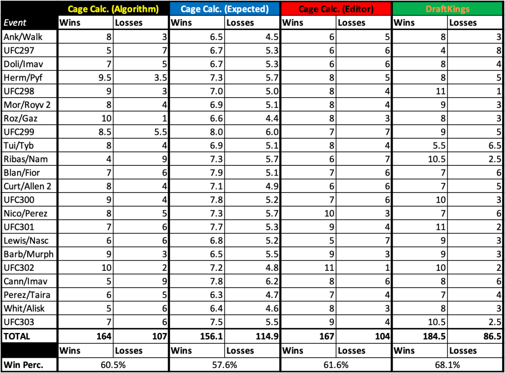 Given the probabilities of each fight, the expected win-loss record of the algorithm would be roughly 296-217, for a hit percentage of about 57.7 percent. The algorithm performed nearly as precisely as expected, producing a final win-loss record of 293-220, for a hit percentage of 57.1 percent. The Cage Calculus algorithm, as currently designed, only produces probabilities, not hard and fast predictions (perhaps a more robust, granular model is in the cards for 2025).