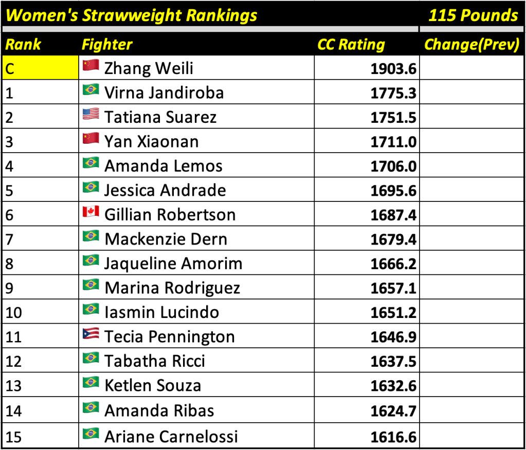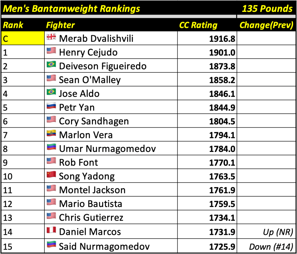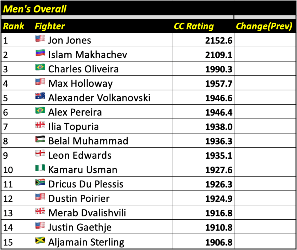 These rankings will also rank the top 15 male and female fighters overall. Note, we do not call them “pound-for-pound” rankings as most do, as the CC Rating is a metric of dominance and performance as opposed to talent relative to size. So, they will simply be called “Overall Male” and “Overall Female” rankings.