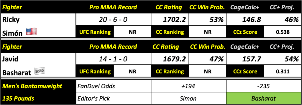 - CageCalc+ sees it as close, but gives Basharat the edge. He’s got a good edge in the offensive striking and is decent enough as a grappler to be a well-rounded opponent to mitigate Simon’s skills.