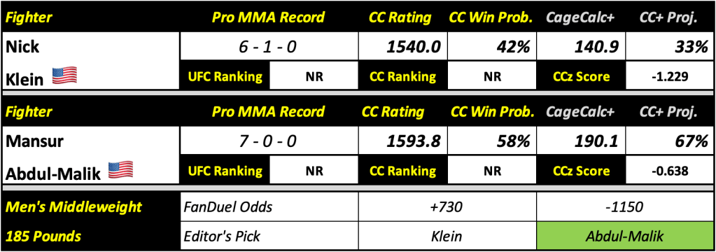 - CageCalc+ has this as a runaway. Abdul-Malik’s striking gives him a big edge, despite Klein’s relentless wrestling.