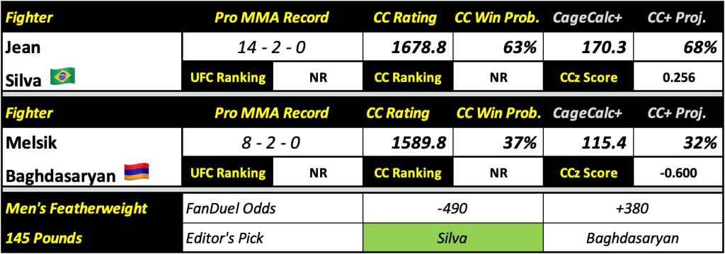 - CageCalc+ sees this for Silva as well. While Baghdasaryan is the slightly better striker, Silva will have all the grappling in this one. Silva also is closer than most would think in terms of the striking numbers.
