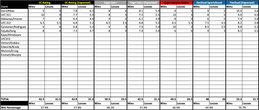 After every event, check back in to see how Cage Calculus did at forecasting the prior week’s slate of UFC fights. These standing will compare our traditional algorithm, our new CageCalc+ model, our editor’s picks, and FanDuel Sportsbook’s favorites. You can also see how many wins each algorithm expects, given the probabilities it generates (for example, if the algorithm gives ten fighters a 60 percent chance of winning, it would only expect six of them to win with those odds). How close the algorithm is to its expected numbers gives a better picture of its accuracy.