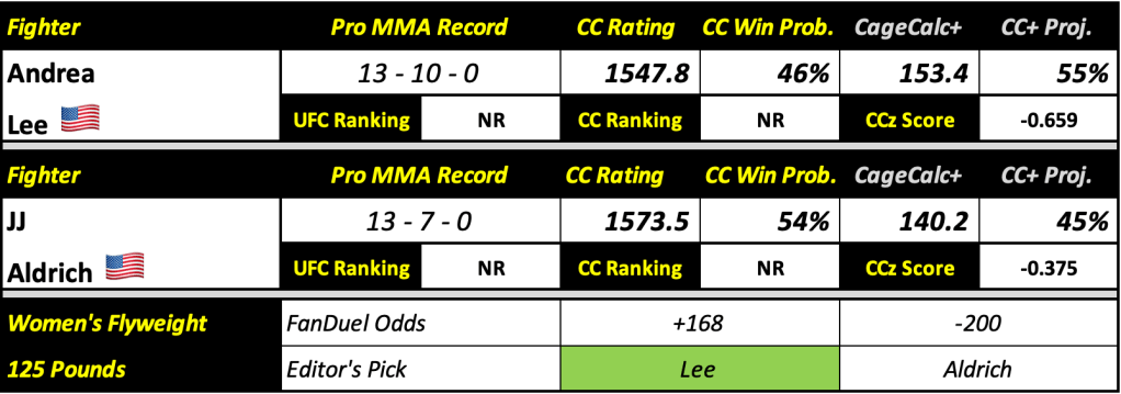 - CageCalc+ has this for Lee largely because of her grappling edge and how close the striking metrics are. Her grappling and wrestling may be a game changer.
