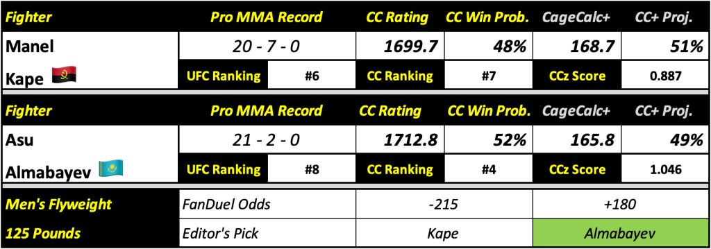 - CageCalc+ has this for Kape and by a razor thin margin. The combination of Kape’s aggressive striking and good takedown defense makes him a slim favorite.
