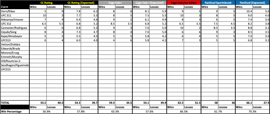 After every event, check back in to see how Cage Calculus did at forecasting the prior week’s slate of UFC fights. These standing will compare our traditional algorithm, our new CageCalc+ model, our editor’s picks, and FanDuel Sportsbook’s favorites. You can also see how many wins each algorithm expects, given the probabilities it generates (for example, if the algorithm gives ten fighters a 60 percent chance of winning, it would only expect six of them to win with those odds). How close the algorithm is to its expected numbers gives a better picture of its accuracy.