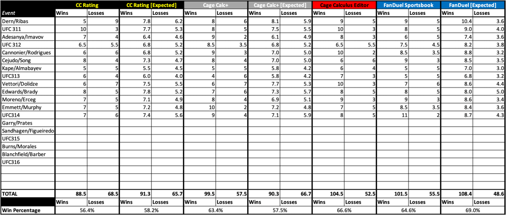After every event, check back in to see how Cage Calculus did at forecasting the prior week’s slate of UFC fights. These standing will compare our traditional algorithm, our new CageCalc+ model, our editor’s picks, and FanDuel Sportsbook’s favorites. You can also see how many wins each algorithm expects, given the probabilities it generates (for example, if the algorithm gives ten fighters a 60 percent chance of winning, it would only expect six of them to win with those odds). How close the algorithm is to its expected numbers gives a better picture of its accuracy.