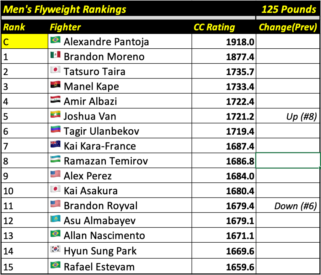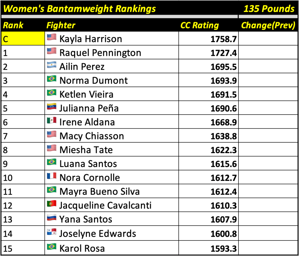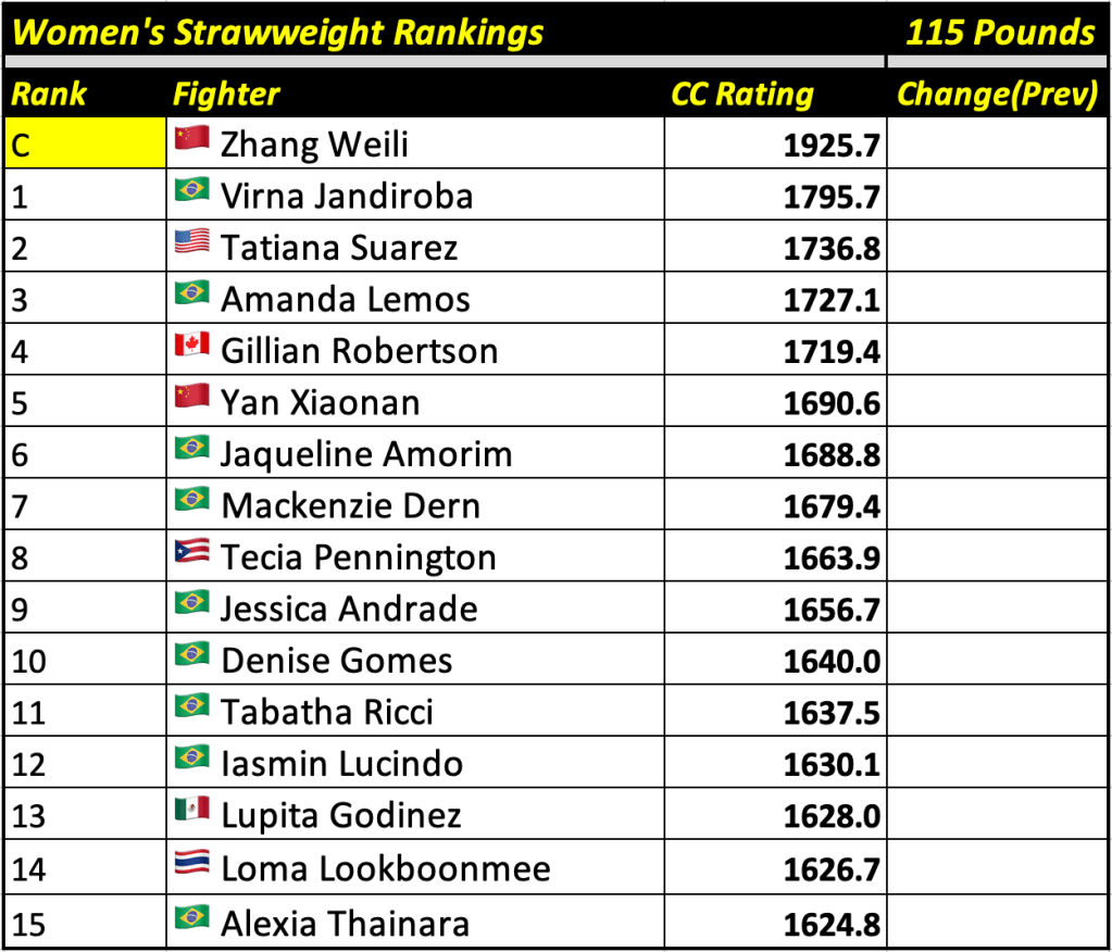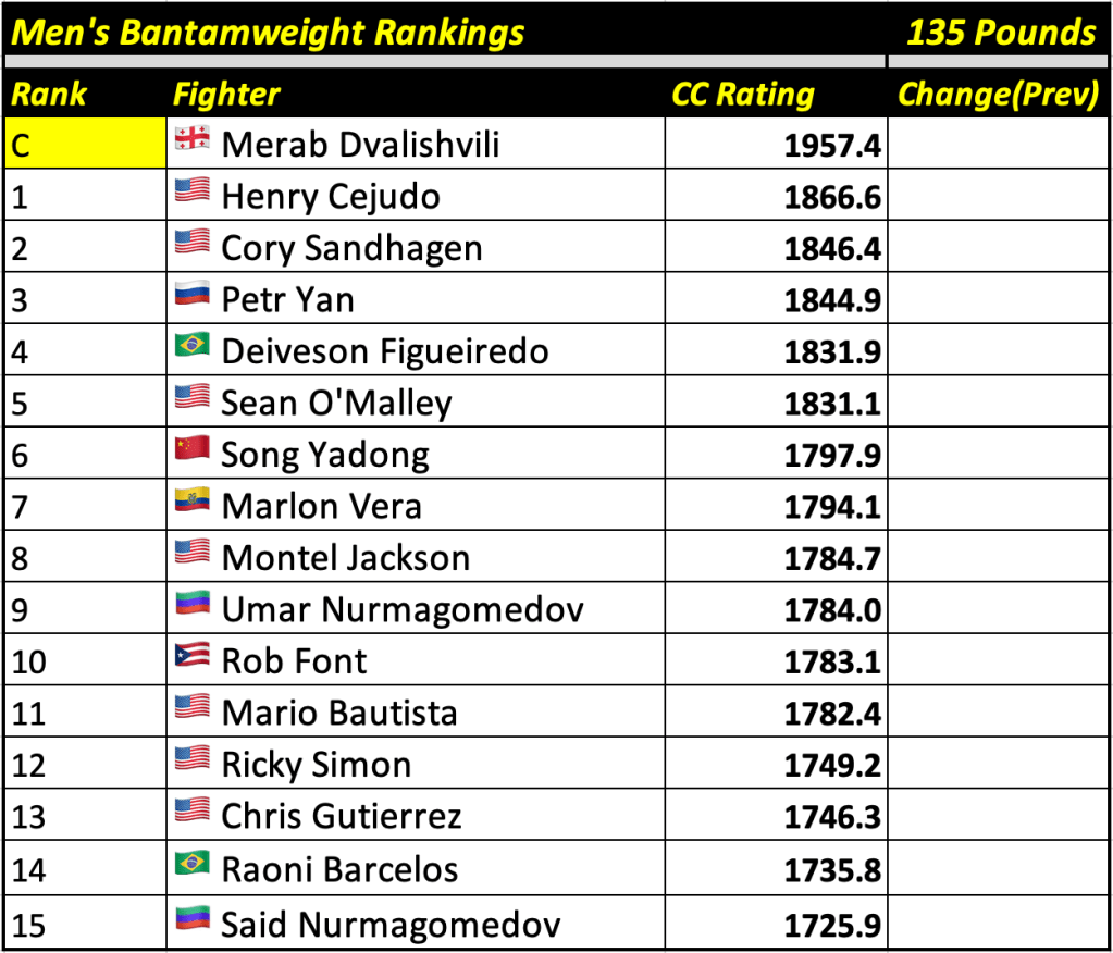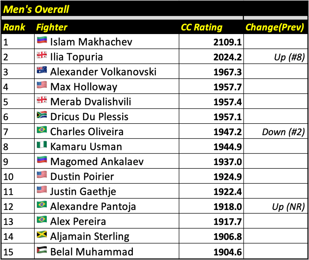 These rankings will also rank the top 15 male and female fighters overall. Note, we do not call them “pound-for-pound” rankings as most do, as the CC Rating is a metric of dominance and performance as opposed to talent relative to size. So, they will simply be called “Overall Male” and “Overall Female” rankings.