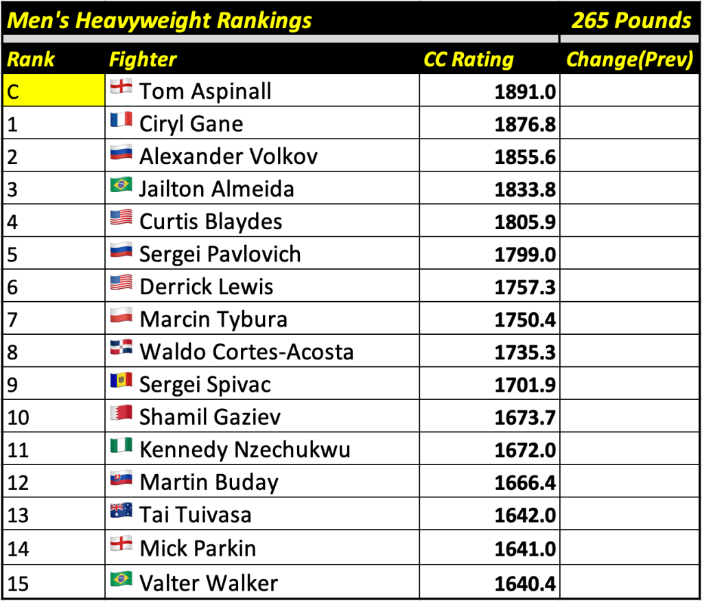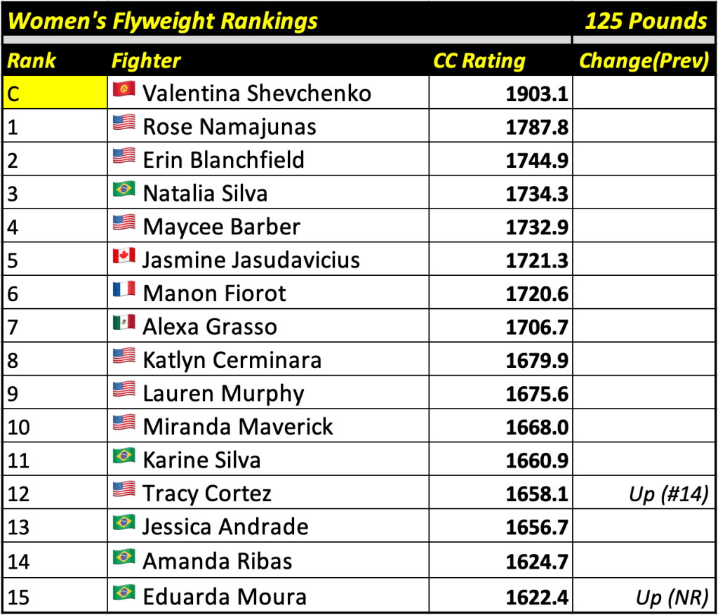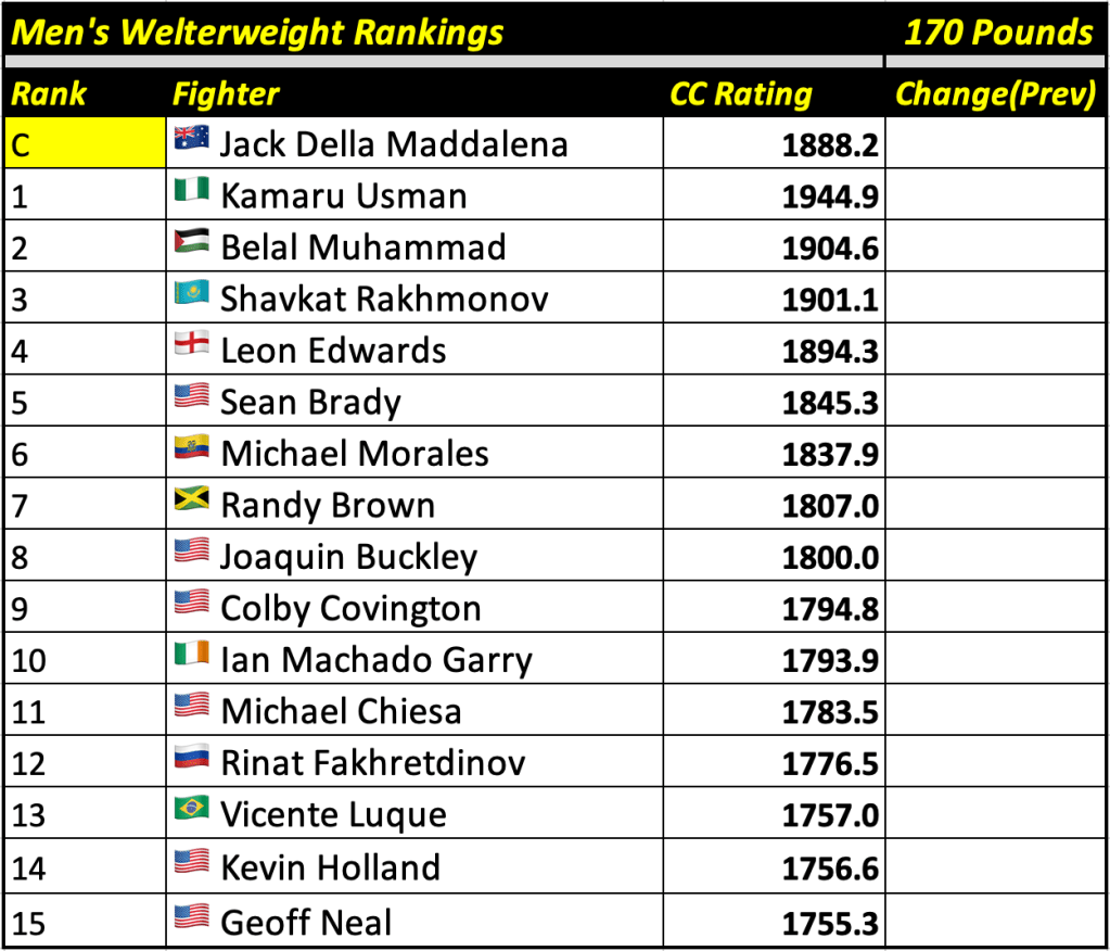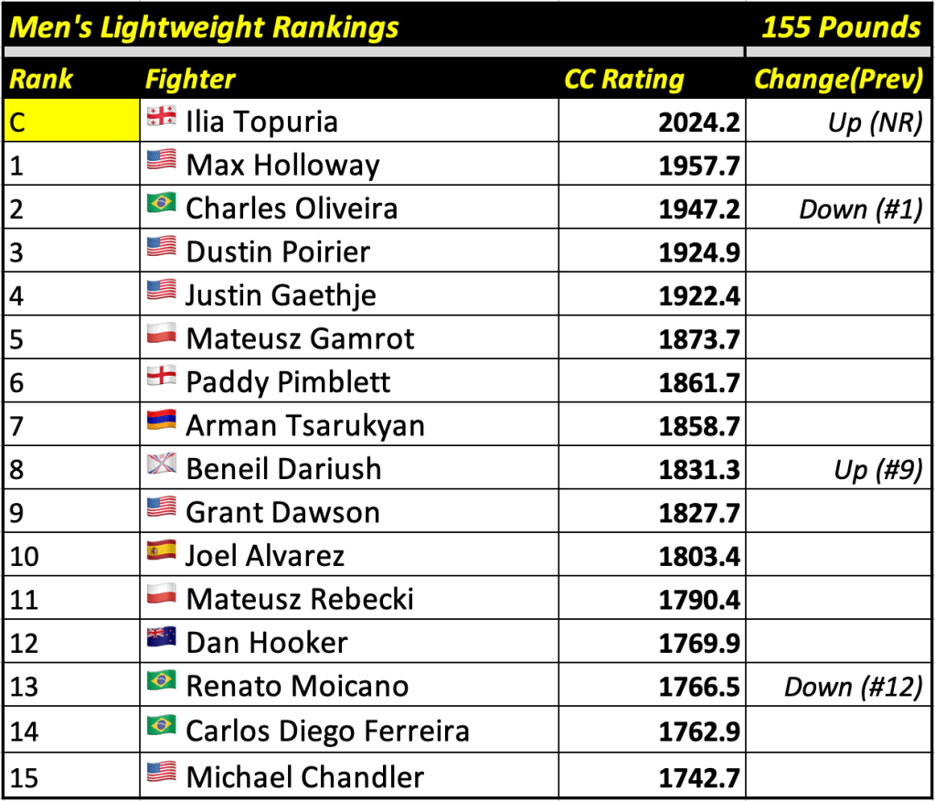 These rankings will also rank the top 15 male and female fighters overall. Note, we do not call them “pound-for-pound” rankings as most do, as the CC Rating is a metric of dominance and performance as opposed to talent relative to size. So, they will simply be called “Overall Male” and “Overall Female” rankings.