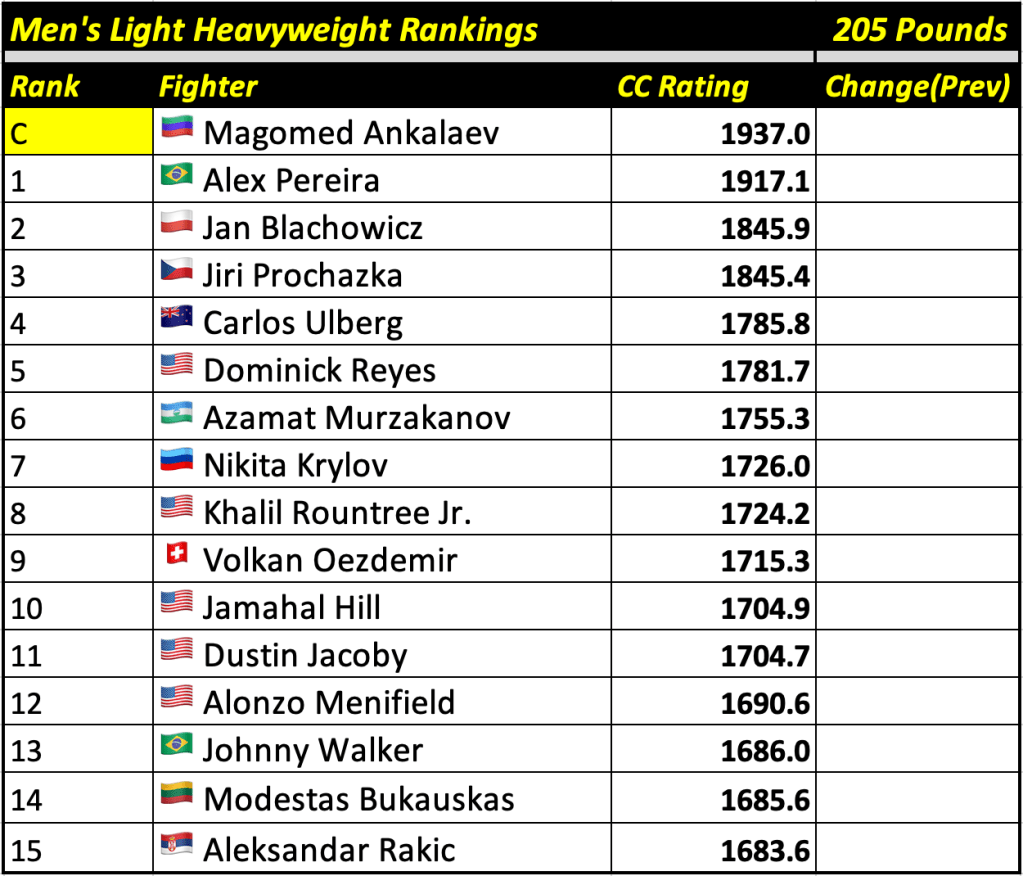 After every UFC fight card, Cage Calculus will publish up-to-date rankings based on our forecast algorithm. The rankings will display the champion and the top 15 contenders in each weight division, alongside their CC Rating (the champion will always be displayed at the top regardless of whether or not they are the highest rated fighter in their division).