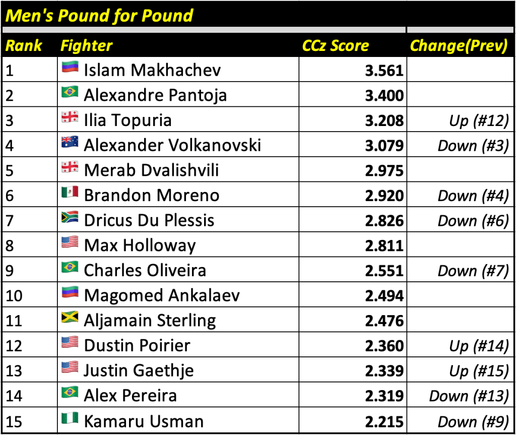 The Cage Calculus Pound for Pound Rankings is based on a fighter’s CCz Score. The CCz Score is a score that shows how much better a given fighter is than the average fighter in their respective weight class.