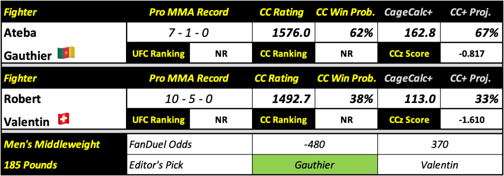 A fighter’s CC win probabilities are based off of a fighter’s Cage Calculus (CC) Rating and their place in the CC Rankings. A fighter’s CageCalc+ Score is determined by a variety of factors and is specific to each matchup. The CageCalc+ projection is an estimated win probability based on this statistic. Each fighter’s new CC Ratings after their bouts will be determined by the first CC win probability only.