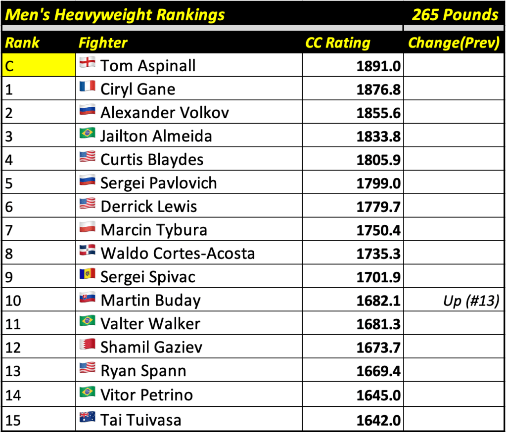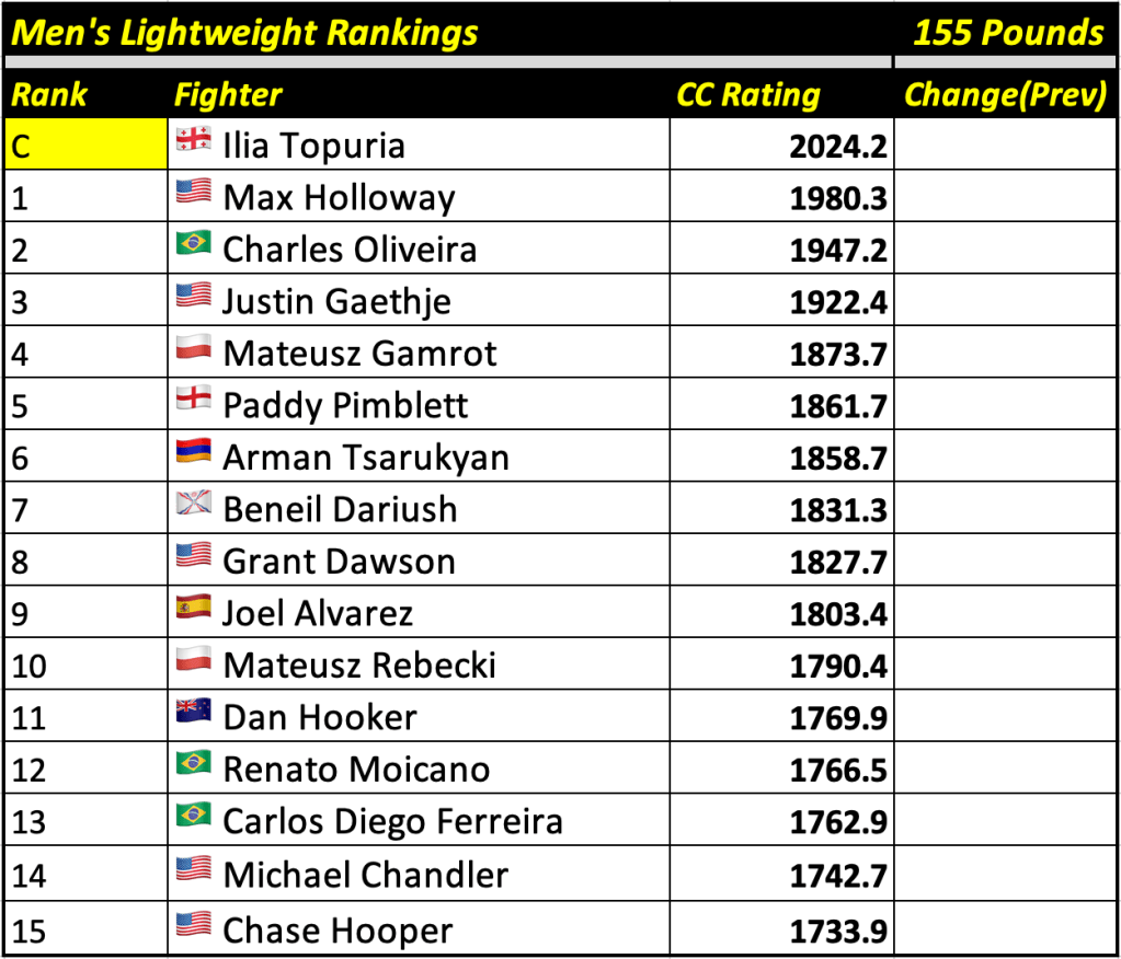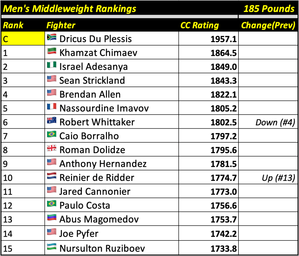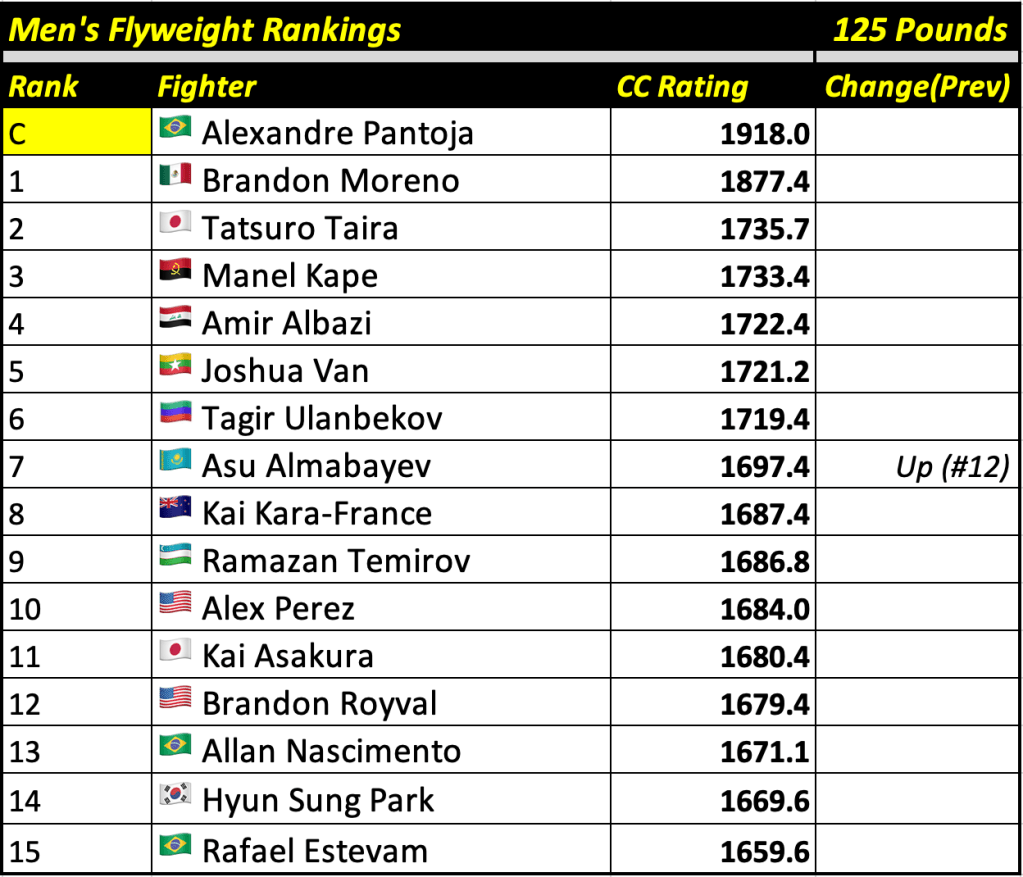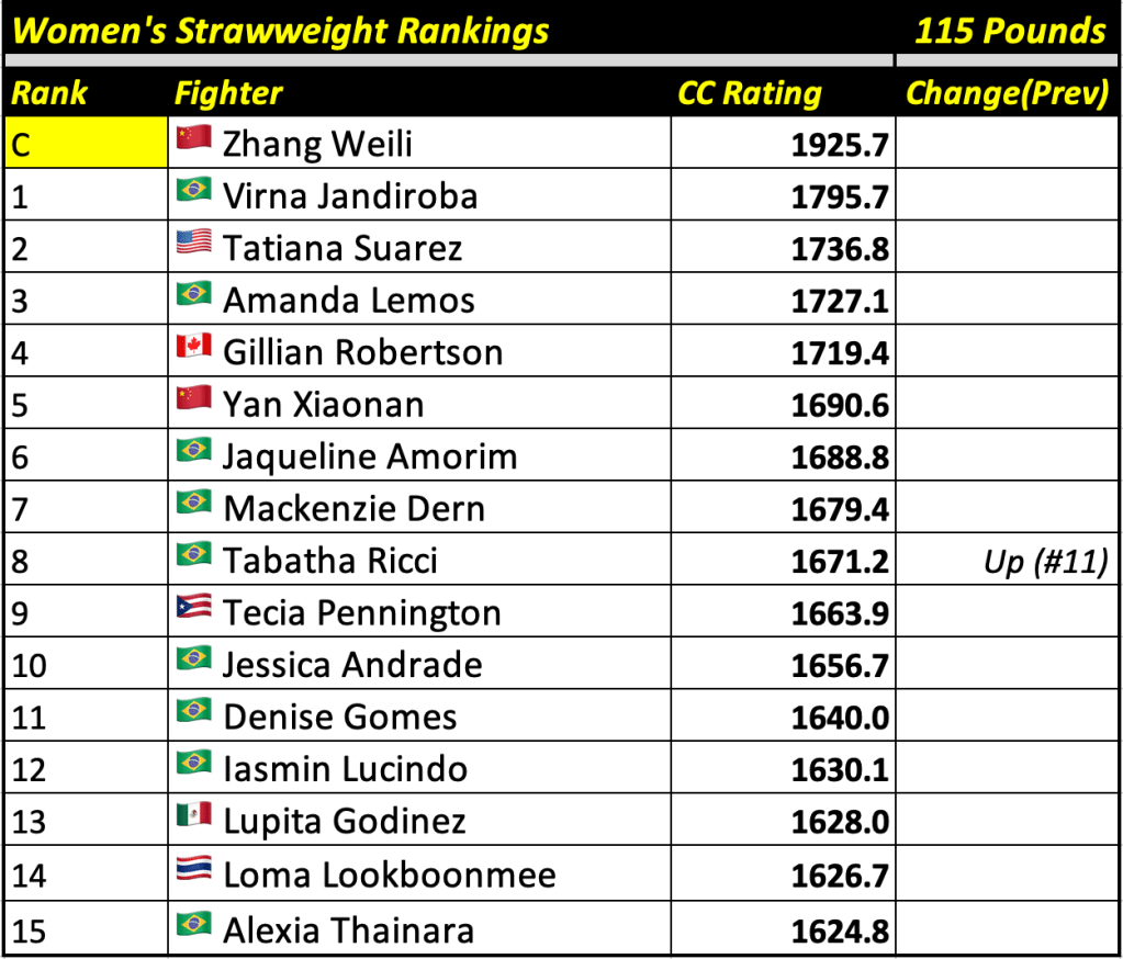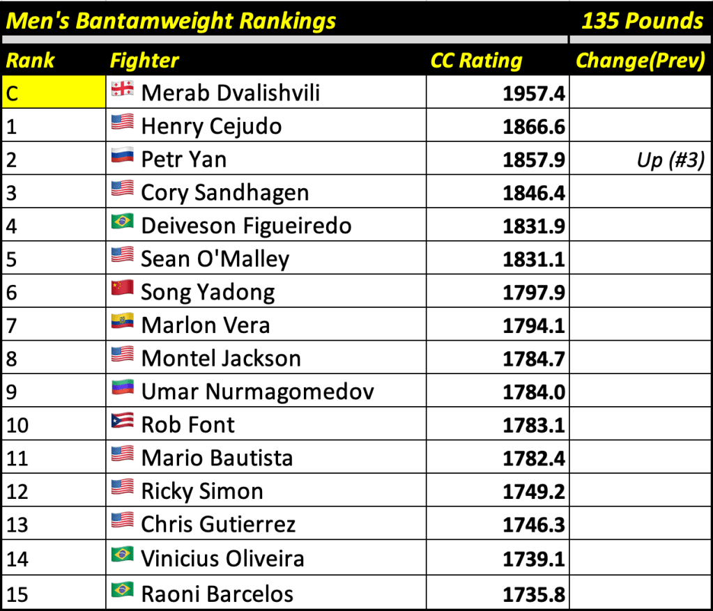 These rankings will also rank the top 15 male and female fighters overall. Note, we do not call them “pound-for-pound” rankings as most do, as the CC Rating is a metric of dominance and performance as opposed to talent relative to size. So, they will simply be called “Overall Male” and “Overall Female” rankings.