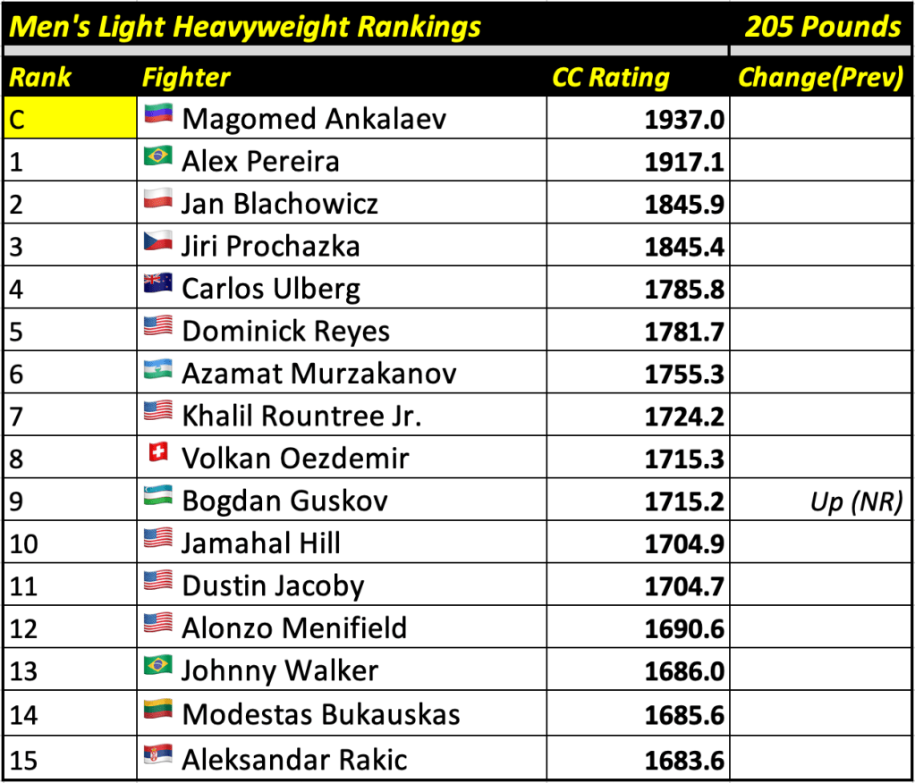 After every UFC fight card, Cage Calculus will publish up-to-date rankings based on our forecast algorithm. The rankings will display the champion and the top 15 contenders in each weight division, alongside their CC Rating (the champion will always be displayed at the top regardless of whether or not they are the highest rated fighter in their division).
