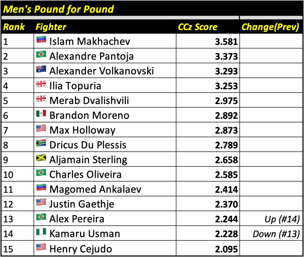 The Cage Calculus Pound for Pound Rankings is based on a fighter’s CCz Score. The CCz Score is a score that shows how much better a given fighter is than the average fighter in their respective weight class.