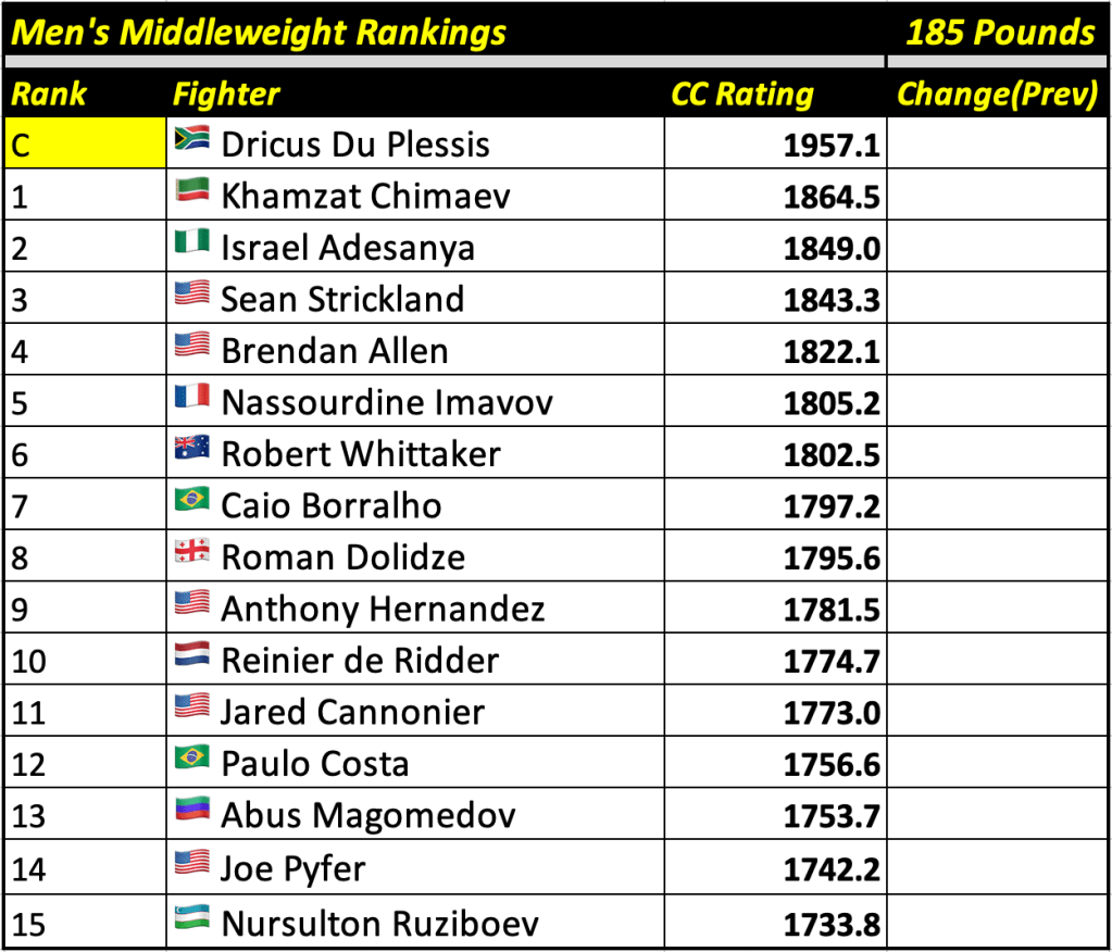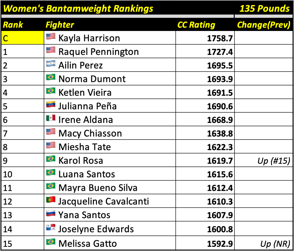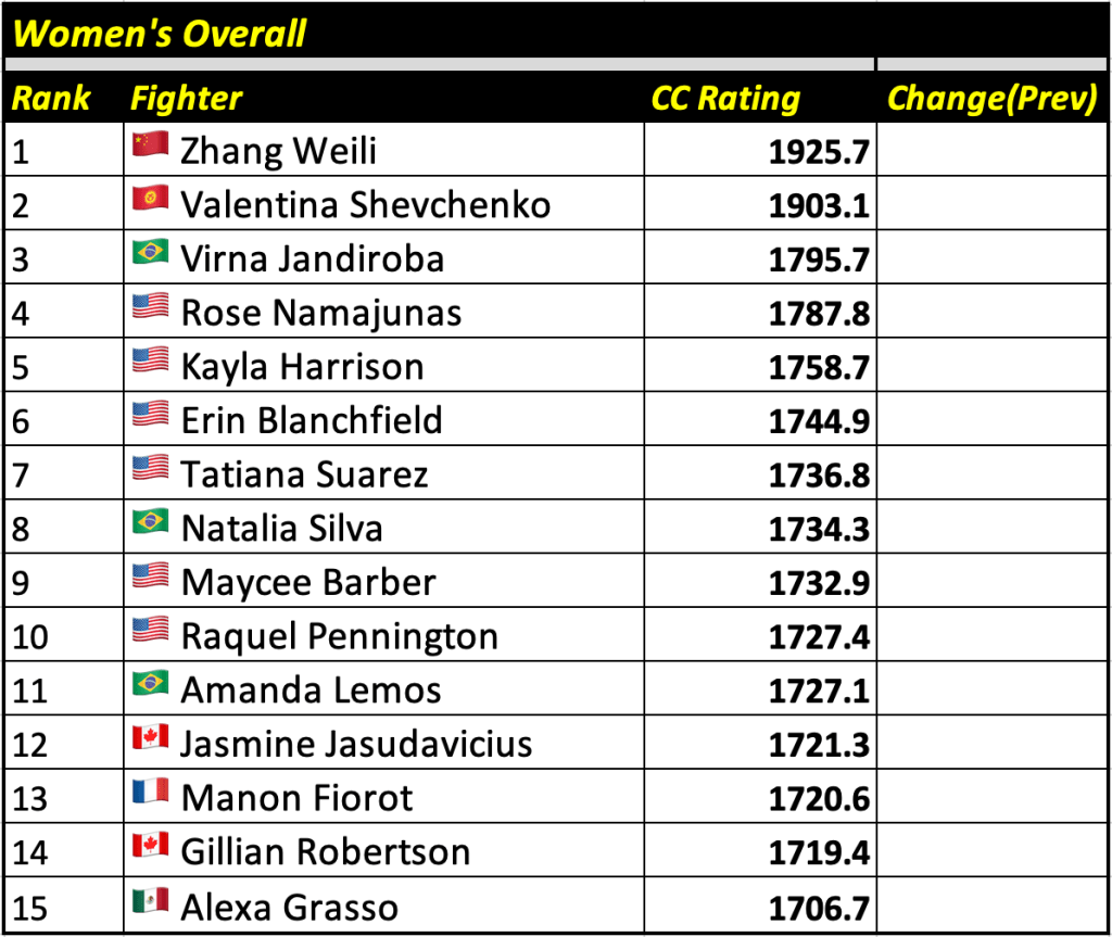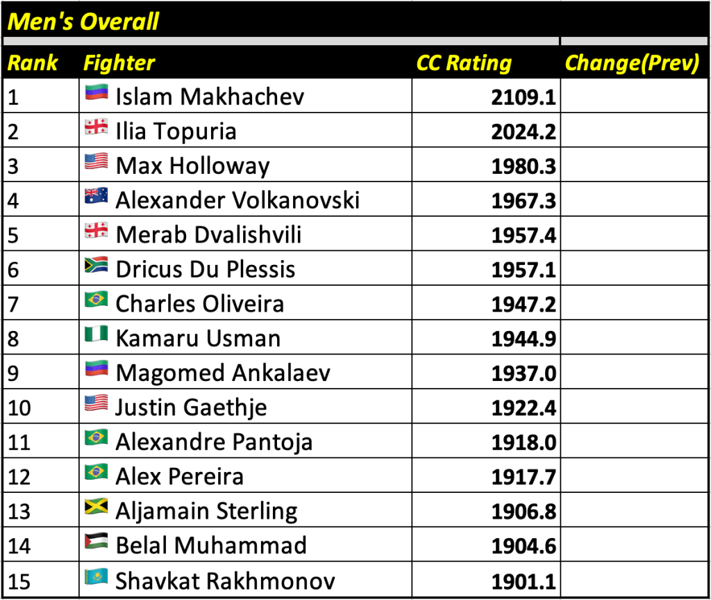 These rankings will also rank the top 15 male and female fighters overall. Note, we do not call them “pound-for-pound” rankings as most do, as the CC Rating is a metric of dominance and performance as opposed to talent relative to size. So, they will simply be called “Overall Male” and “Overall Female” rankings.