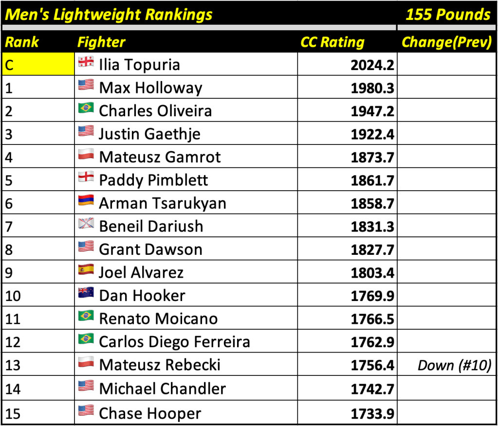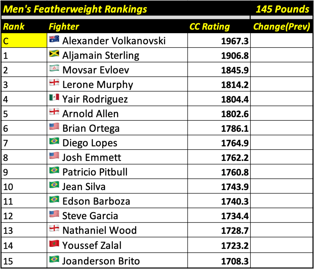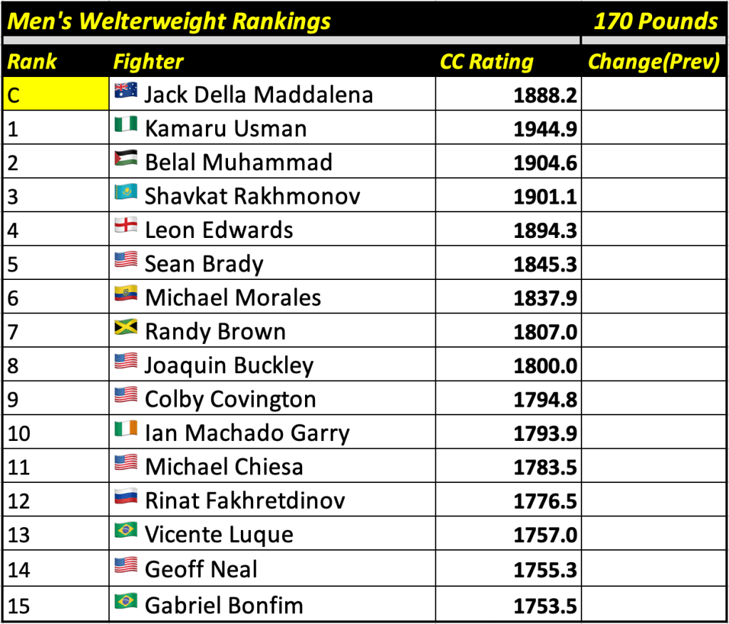 These rankings will also rank the top 15 male and female fighters overall. Note, we do not call them “pound-for-pound” rankings as most do, as the CC Rating is a metric of dominance and performance as opposed to talent relative to size. So, they will simply be called “Overall Male” and “Overall Female” rankings.