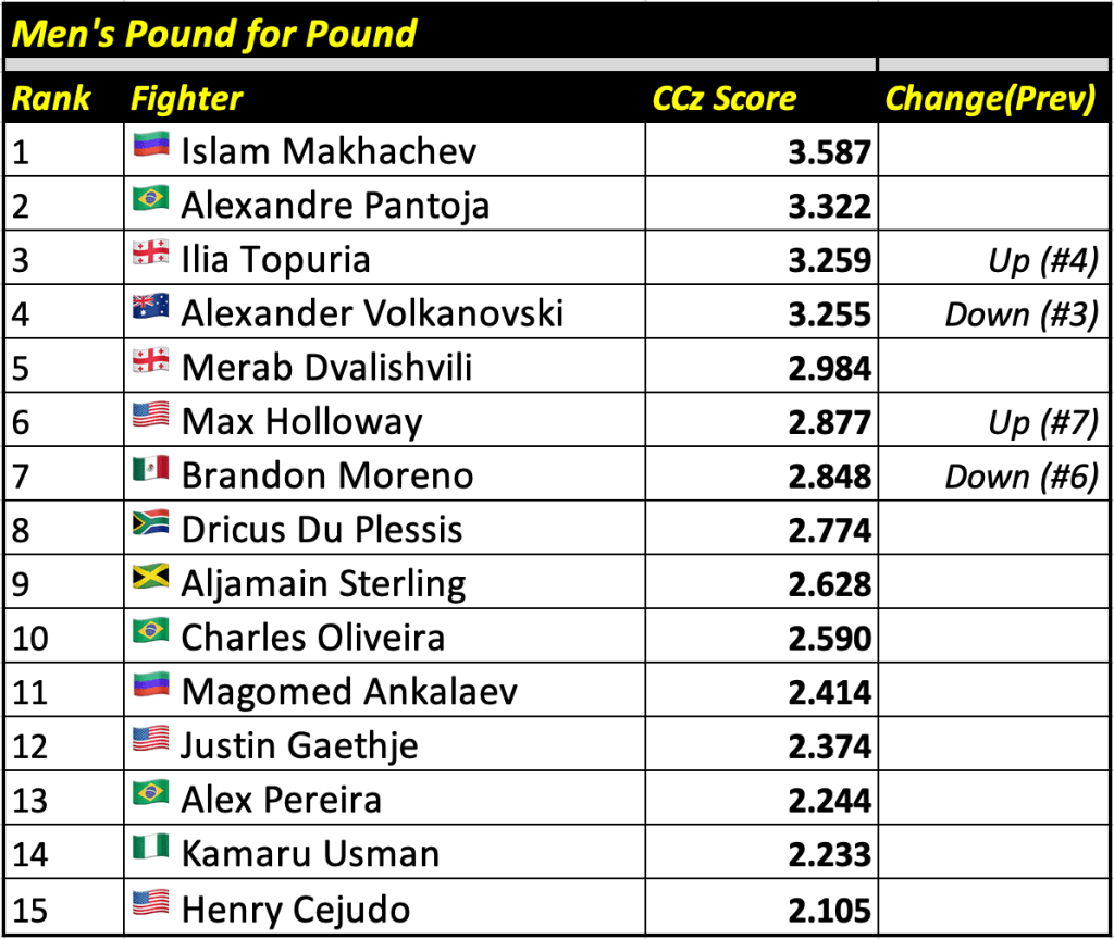 The Cage Calculus Pound for Pound Rankings is based on a fighter’s CCz Score. The CCz Score is a score that shows how much better a given fighter is than the average fighter in their respective weight class.