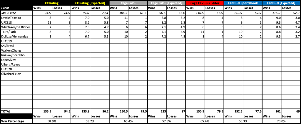 After every event, check back in to see how Cage Calculus did at forecasting the prior week’s slate of UFC fights. These standing will compare our traditional algorithm, our new CageCalc+ model, our editor’s picks, and FanDuel Sportsbook’s favorites. You can also see how many wins each algorithm expects, given the probabilities it generates (for example, if the algorithm gives ten fighters a 60 percent chance of winning, it would only expect six of them to win with those odds). How close the algorithm is to its expected numbers gives a better picture of its accuracy.